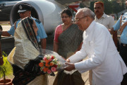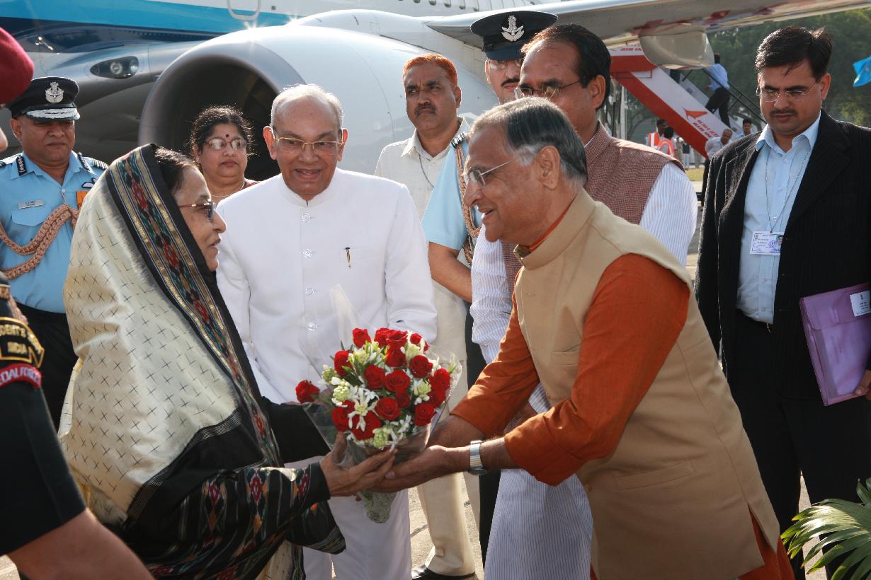 | Caption: | The President of India, Smt Pratibha Devisingh Patil being welcomed by the Governor of Madhya Pradesh, Shri Rameshwar Thakur and the Chief Minister of Madhya Pradesh, Shri Shivraj Singh Chauhan at Gwalior Airport in Madhya Pradesh on Nov 10, 2009 |