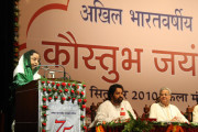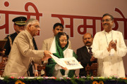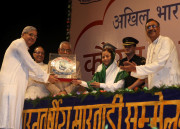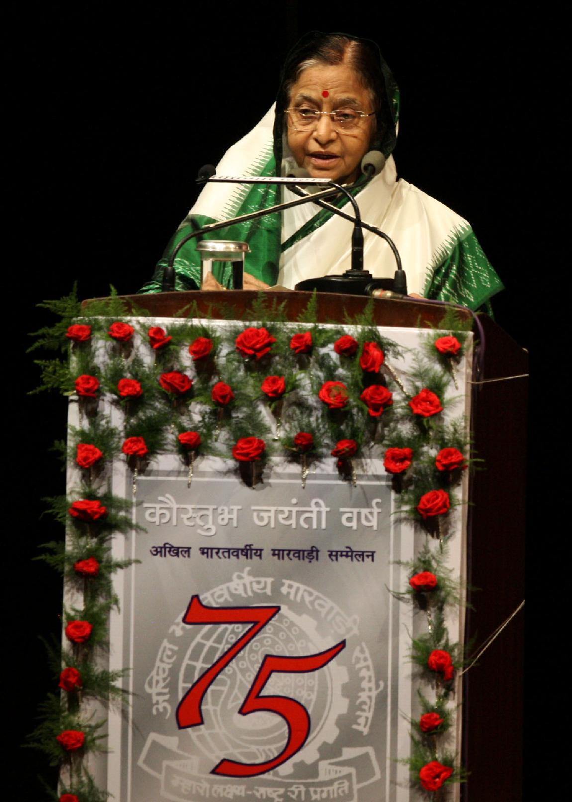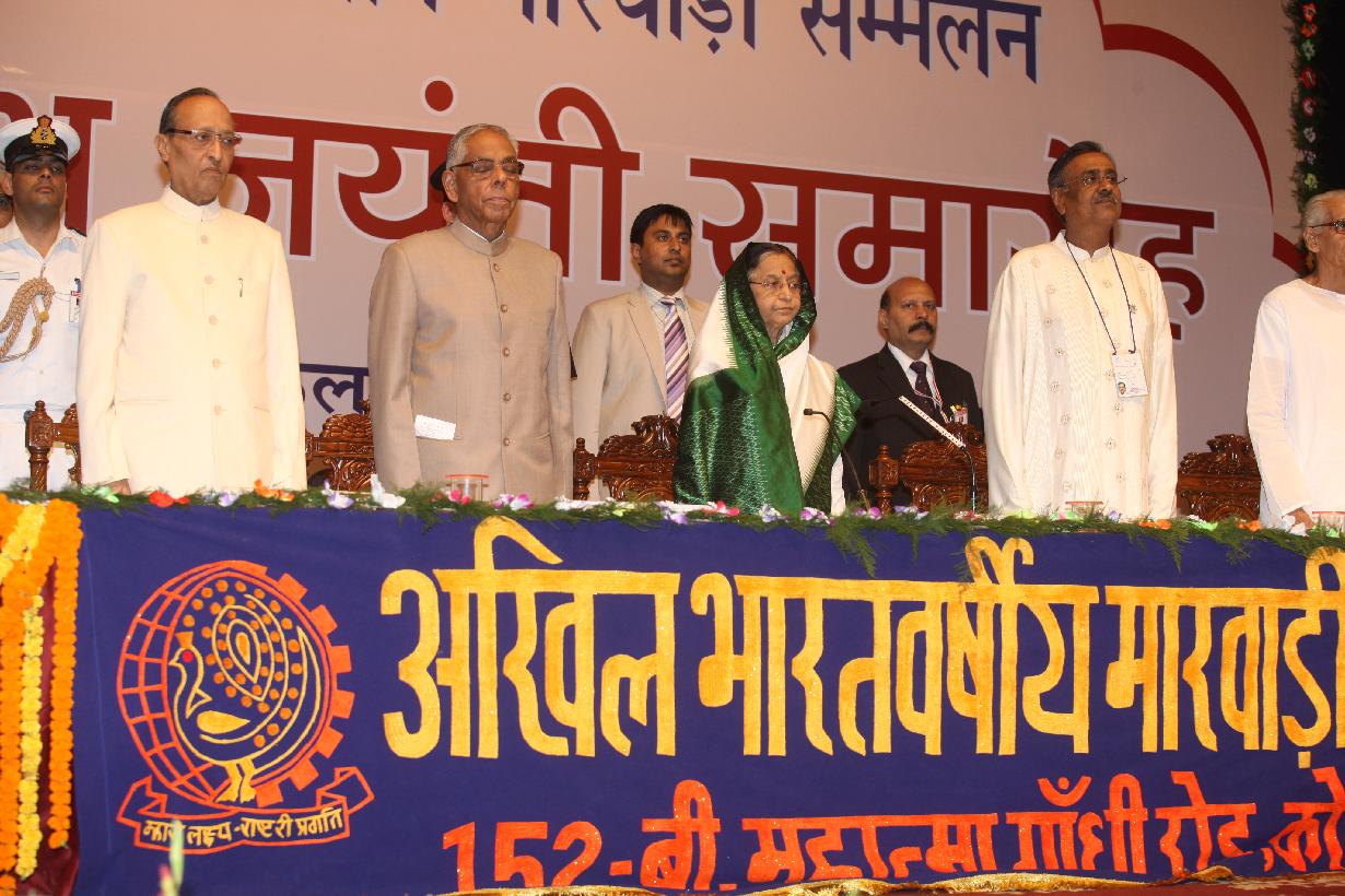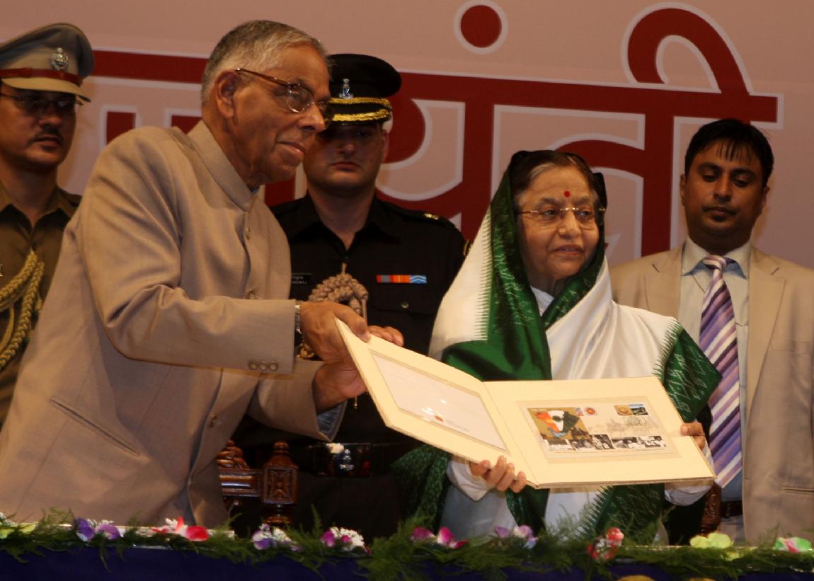 | Caption: | The President of India, Smt Pratibha Devisingh Patil at the Platinum Jubilee Celebrations of the Marwari Federation and being presented the first copy of the Special Cover by The Governor of West Bengal, Shri M K Narayanan at Kolkata in West Bengal on Sep 22, 2010 |