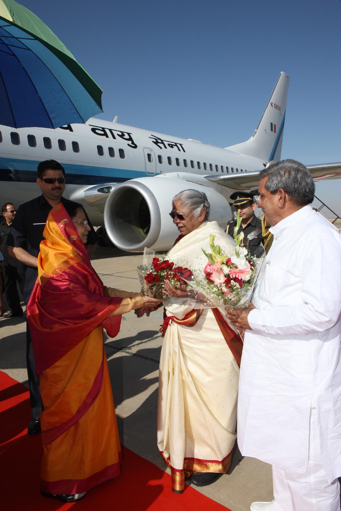 | Caption: | The President of India, Smt Pratibha Devisingh Patil being welcomed by the Governor of Rajasthan, Smt Prabha Rau at Bikaner Airport in Rajasthan on Feb 28, 2010 |