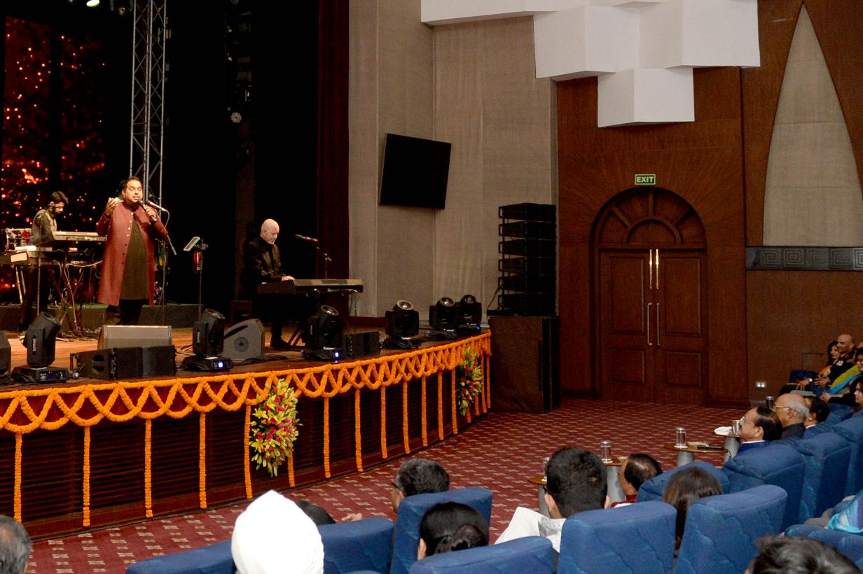 | Caption: | The President of India, Shri Ram Nath Kovind attended a cultural programme 'Music of India' by Shri Shankar Mahadevan, Shri Ehsaan Noorani and Shri Aloysuis Mendonsa, at Rashtrapati Bhavan Cultural Centre on November 26, 2019. |