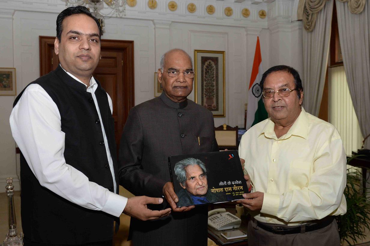 | Caption: | Shri Milan Prabhat from Lucknow and Shri Harsh Vardhan, Writer & Editor presenting a Coffee Table Book 'Geeton ke Darvesh: Gopal Das Neeraj' to the President of India, Shri Ram Nath Kovind, at Rashtrapati Bhavan on October 26, 2018. |