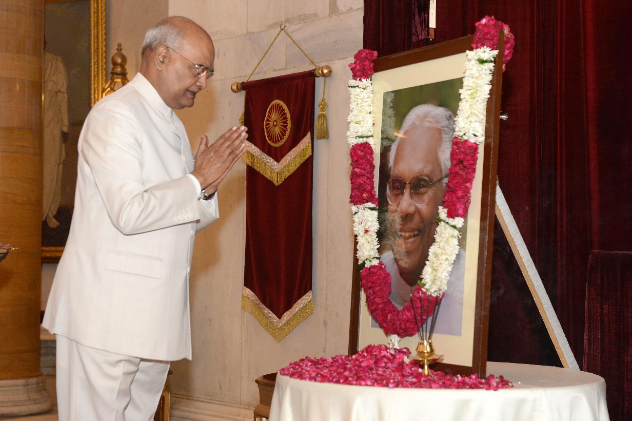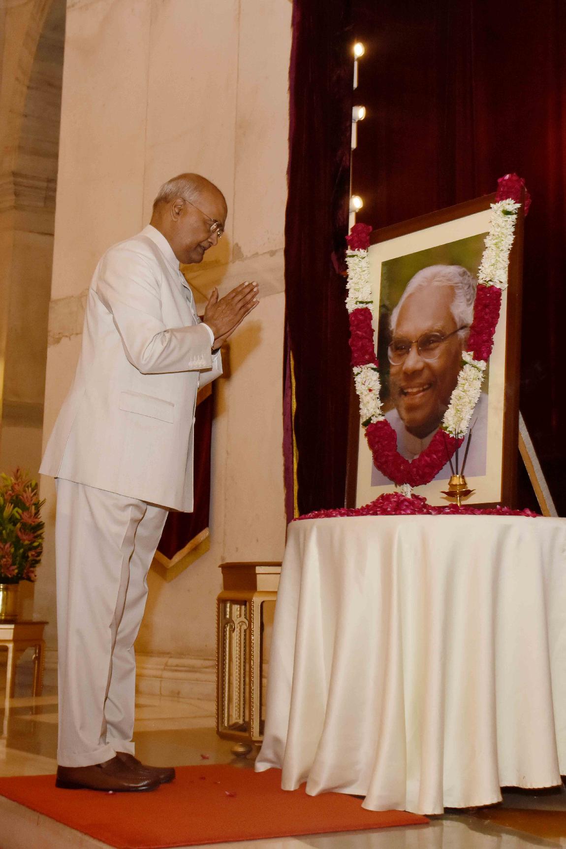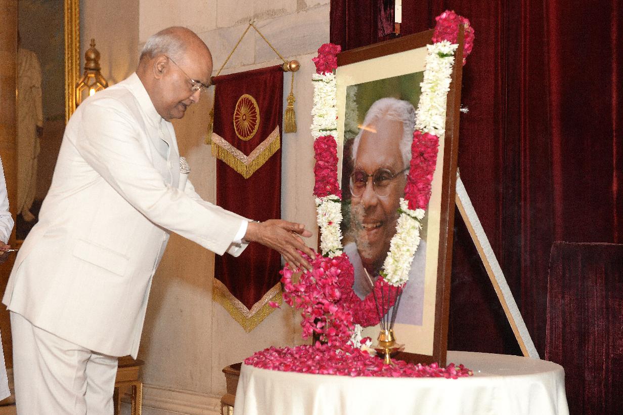 | Caption: | The President of India, Shri Ram Nath Kovind paying floral tributes at the portrait of the former President of India, late Shri K.R. Narayanan on his birth anniversary, at Rashtrapati Bhavan on October 27, 2018. Family members of Shri K.R. Narayanan also paid tributes to him on the occasion. |