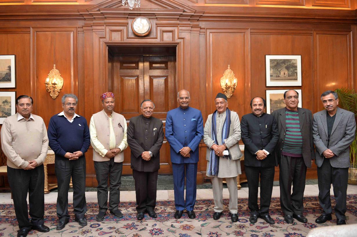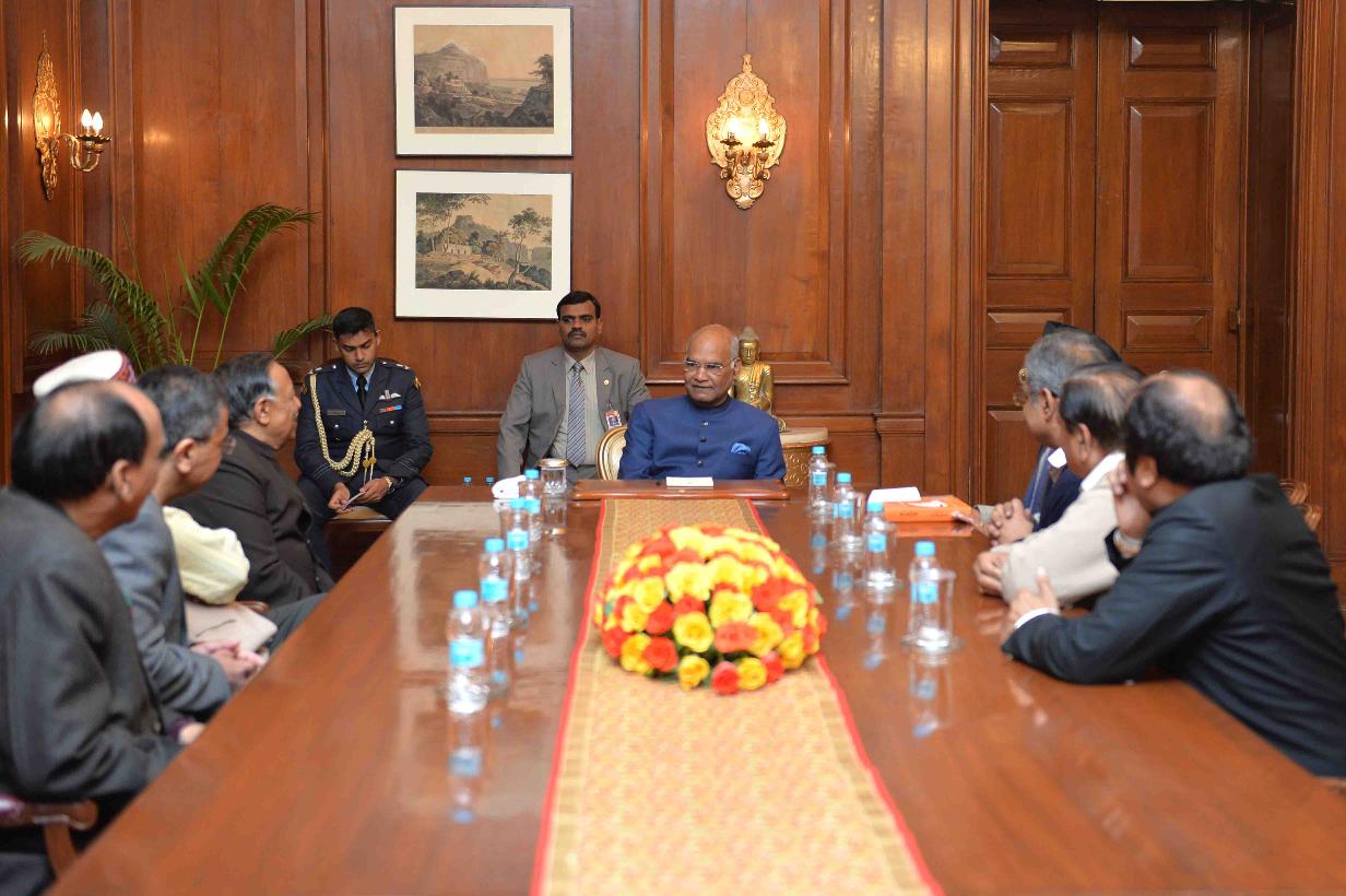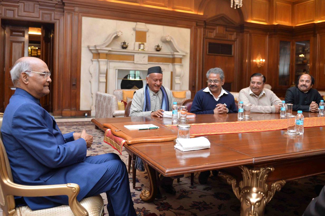 | Caption: | Shri Sandeep Sahani, son of Shri Kedarnath Sahani, former Governor of Sikkim, Shri Bhagat Singh Koshyari, MP (LS) and former Chief Minister of Uttarakhand with others from Dr. Shyama Prasad Mukherjee Nyas meeting with the President of India, Shri Ram Nath Kovind, at Rashtrapati Bhavan on February 01, 2018. |
