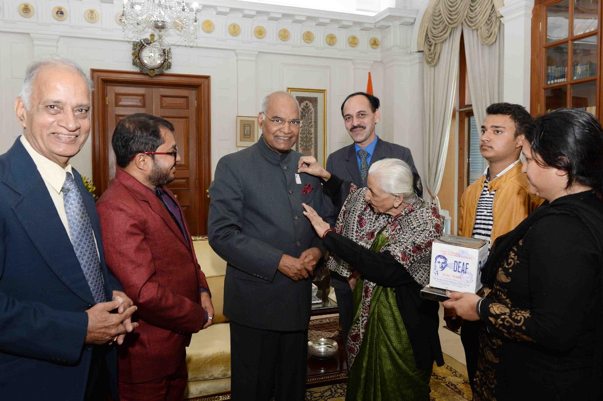 | Caption: | Kumari Surrendar Saini, President with others from All India Federation of the Deaf pinning a flag on the President of India, Shri Ram Nath Kovind, on their Flag Week, at Rashtrapati Bhavan on February 03, 2018. |