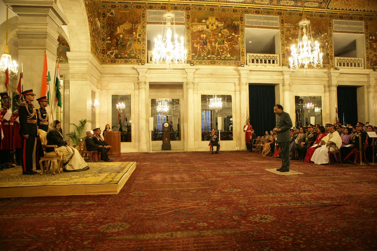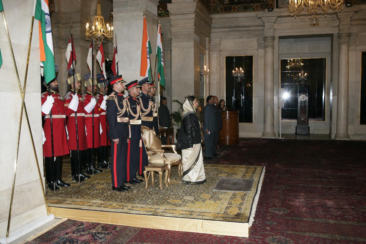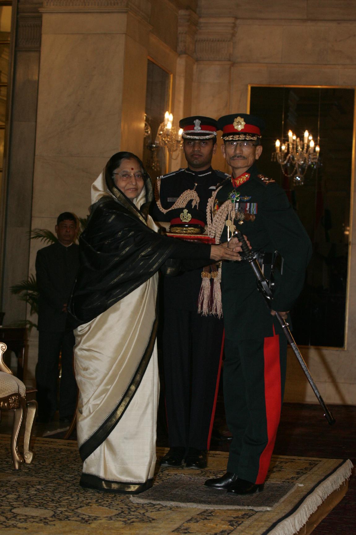 | Caption: | The President of India, Smt Pratibha Devisingh Patil conferring the Honorary Rank of General of the Indian Army the Chief of Staff of the Nepalese Army, General Chhatra Man Singh Gurung at Rashtrapati Bhavan in New Delhi on Dec 14, 2009 |