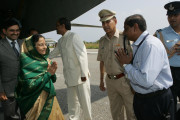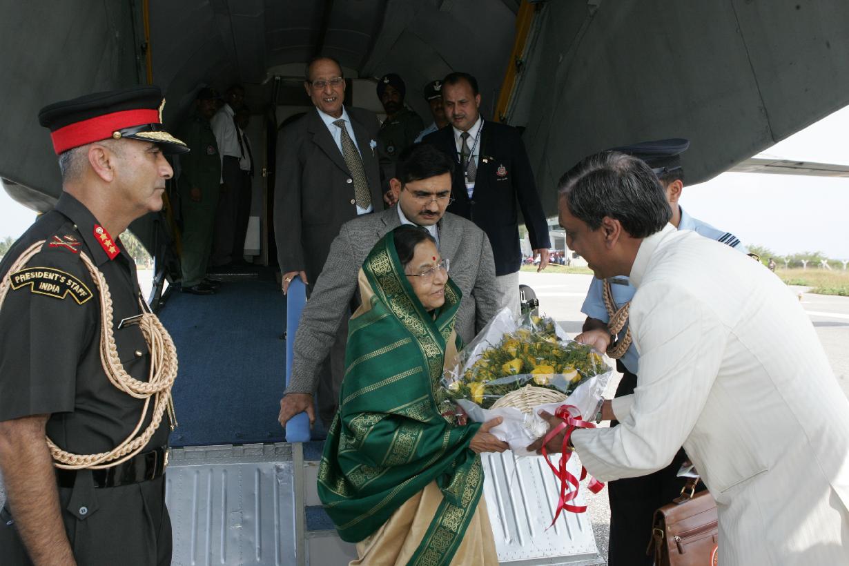| Caption: | The President of India, Smt Pratibha Devisingh Patil being welcomed by the Governor of Lakshadweep, J K Dadoo at Agatti Helipad in Lakshadweep on Dec 27, 2009 |