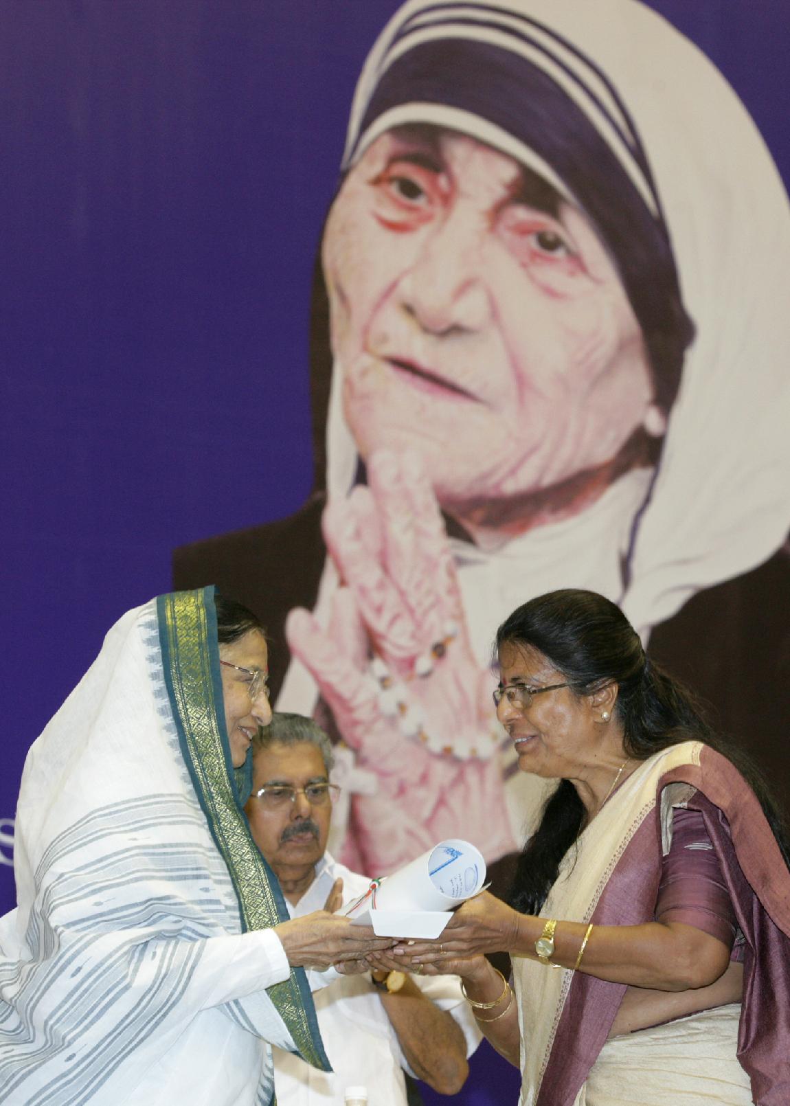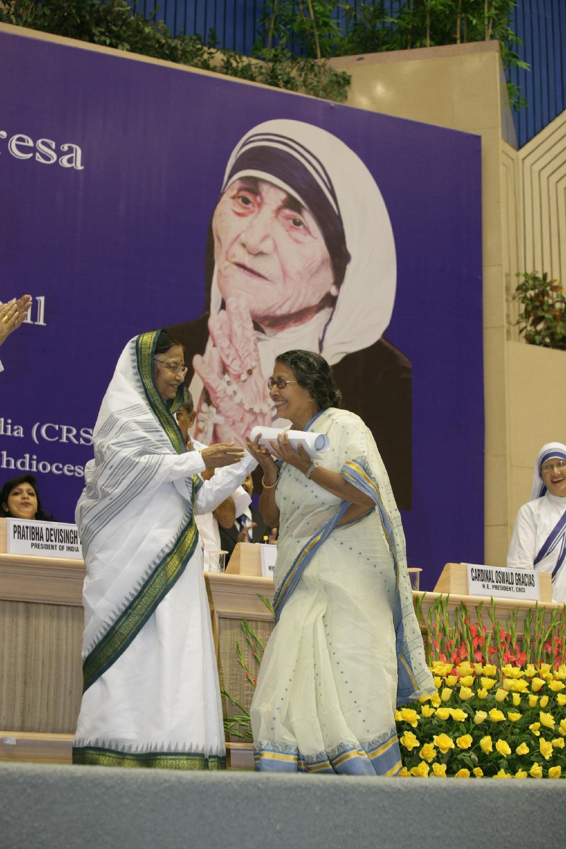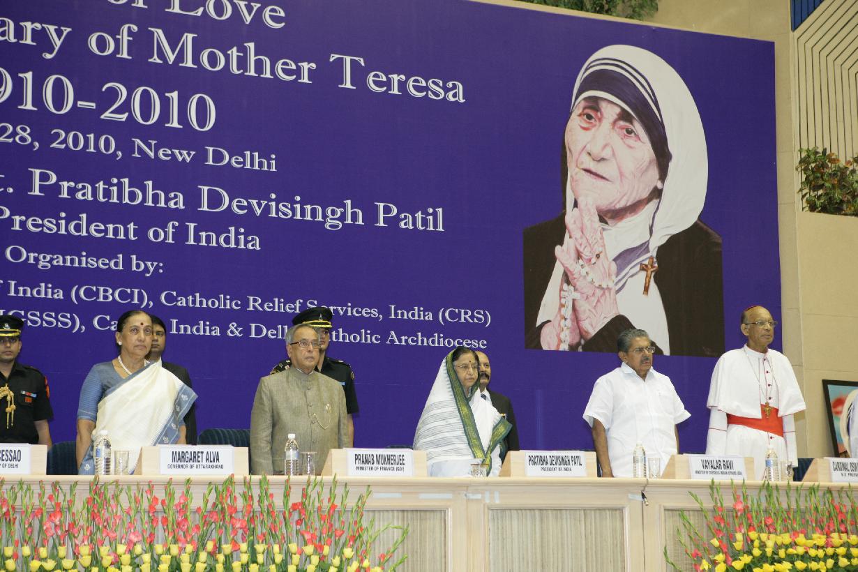 | Caption: | The President of India, Smt Pratibha Devisingh Patil receiving the First Commemorative Coin from the Minister of Finance, Shri Pranab Mukherjee at the Function of the Birth Centenary Celebrations of Bharat Ratna Mother Teresa in New Delhi on Aug 28, 2010 |