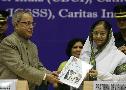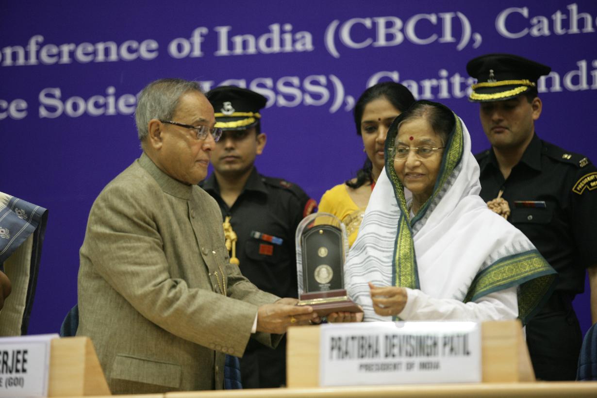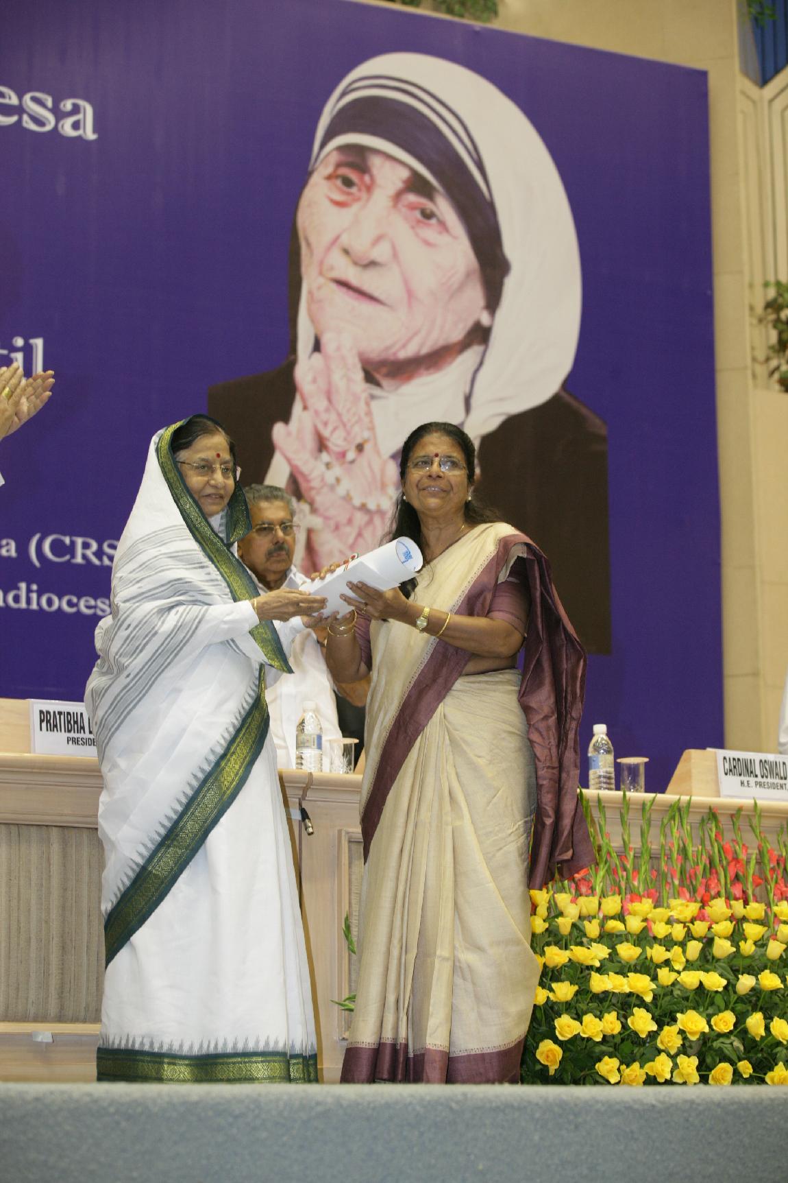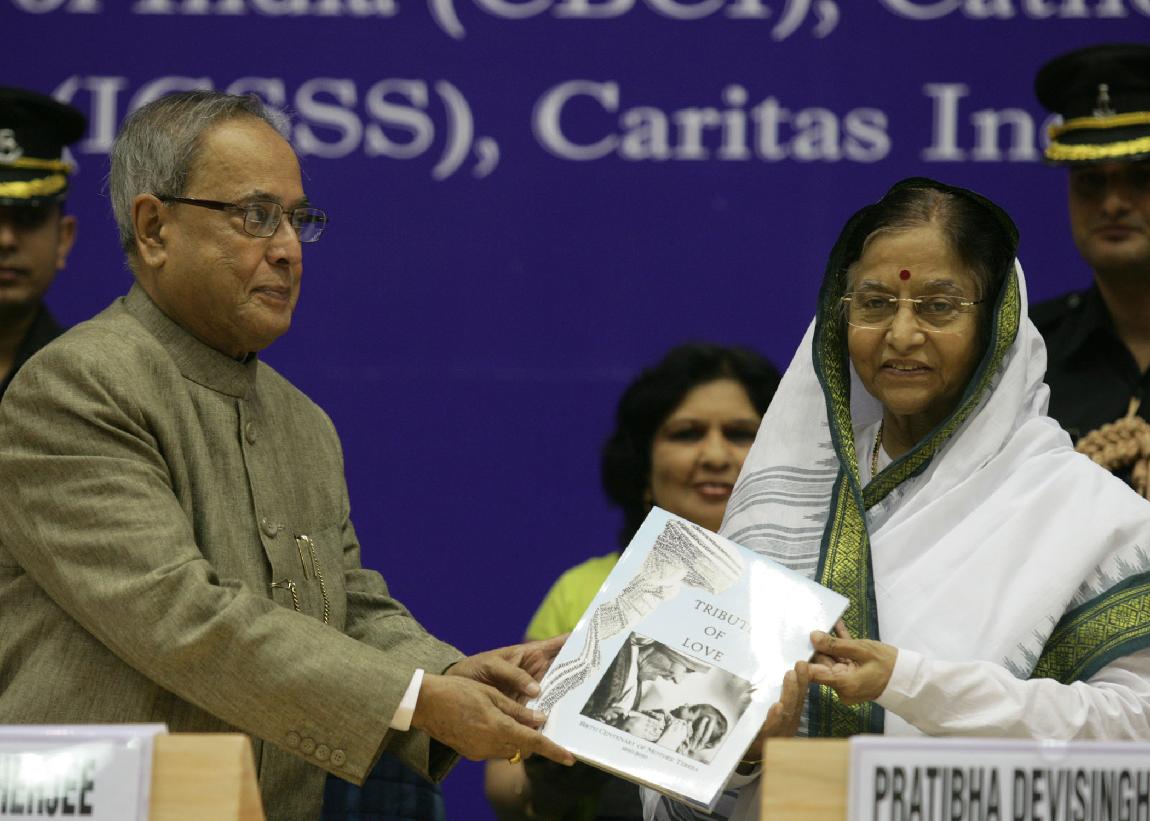| Caption: | The President of India, Smt Pratibha Devisingh Patil receiving the First Commemorative Coin from the Minister of Finance, Shri Pranab Mukherjee at the Function of the Birth Centenary Celebrations of Bharat Ratna Mother Teresa in New Delhi on Aug 28, 2010 |