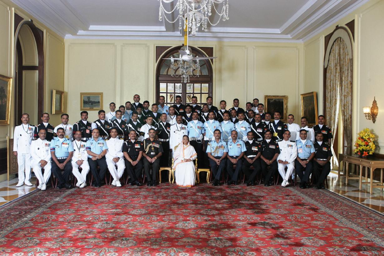 | Caption: | The President of India, Smt Pratibha Devisingh Patil posing for a Group Photograph with Provost Outriders of the three Services at Rashtrapati Bhavan in New Delhi on Aug 15, 2011 |
