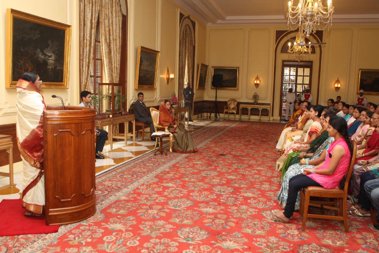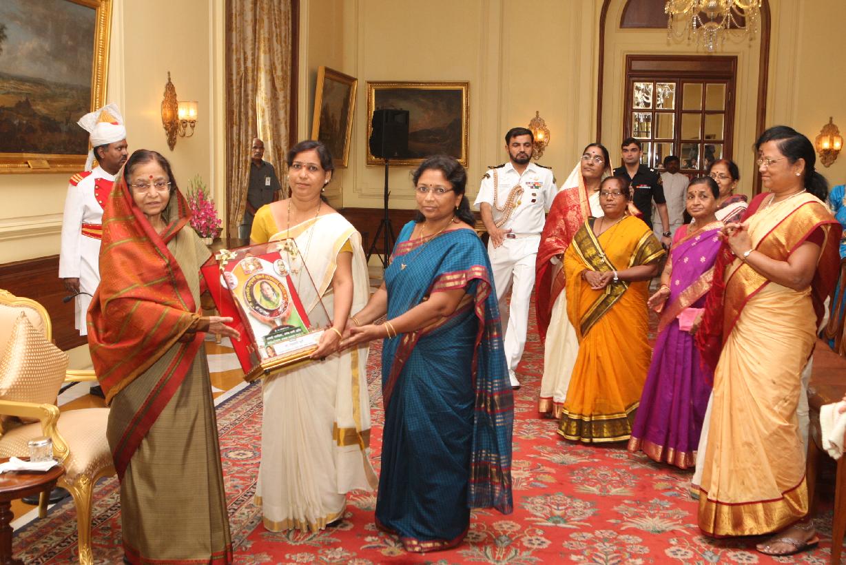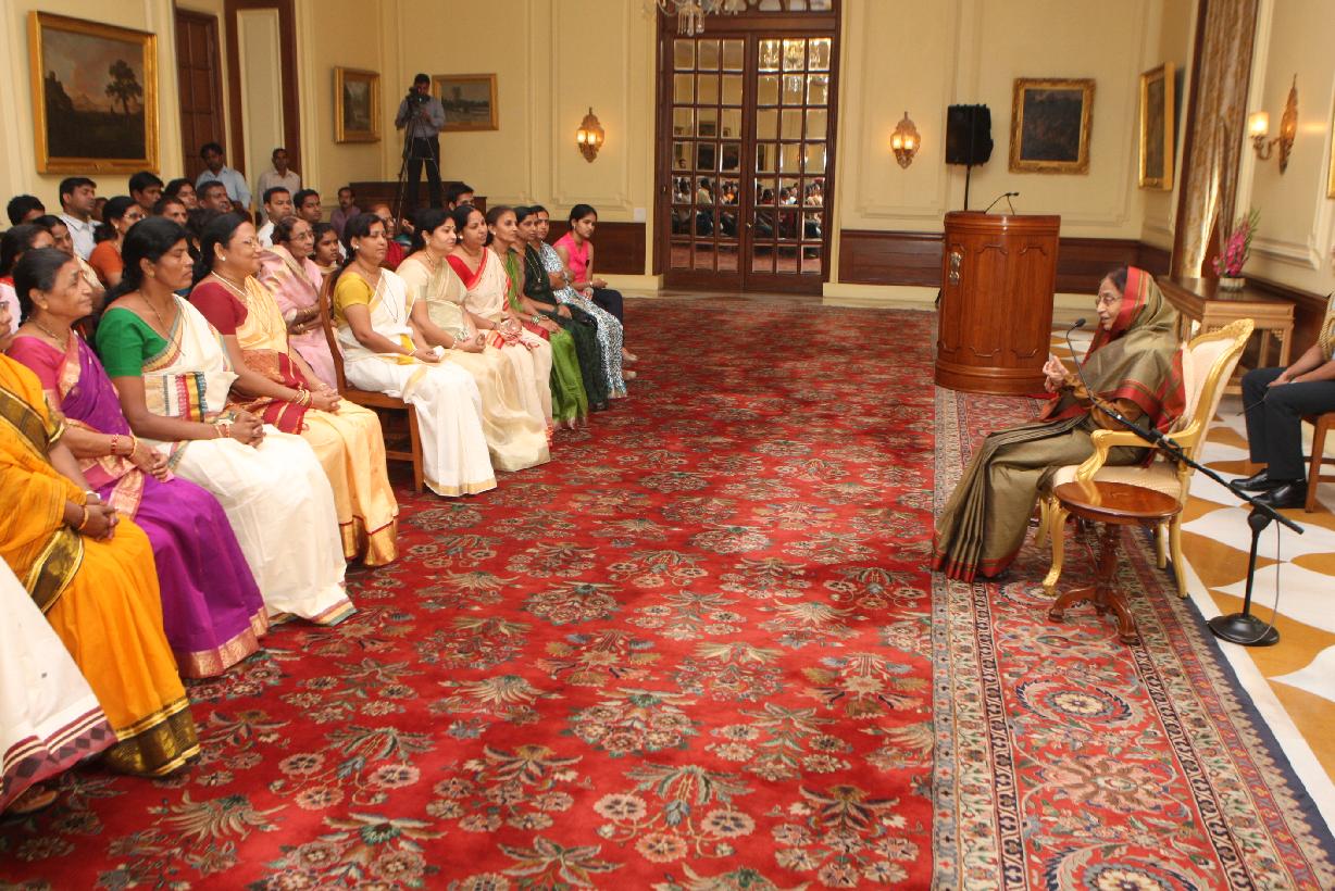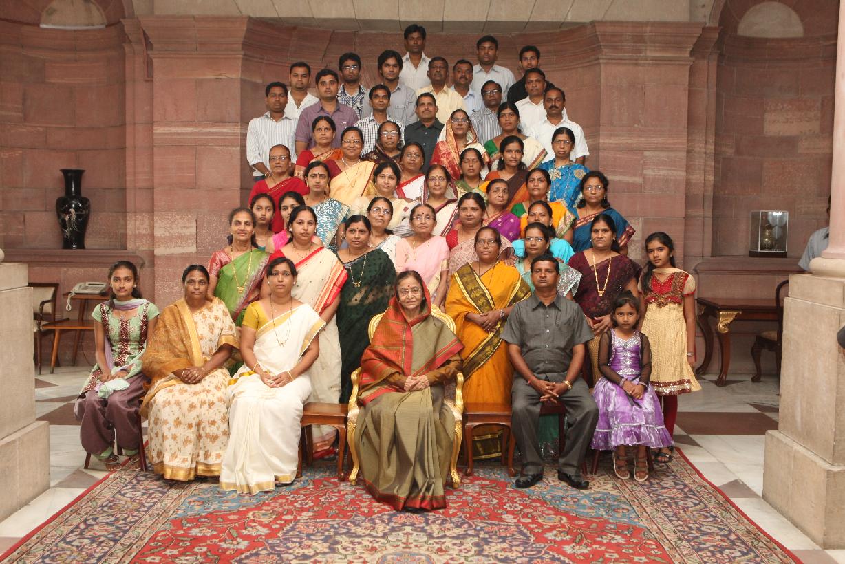 | Caption: | The President of India, Smt Pratibha Devisingh Patil interacting with Smt Devyani Gyaneshwar Kurve and other at Rashtrapati Bhavan in New Delhi on Aug 26, 2011 |