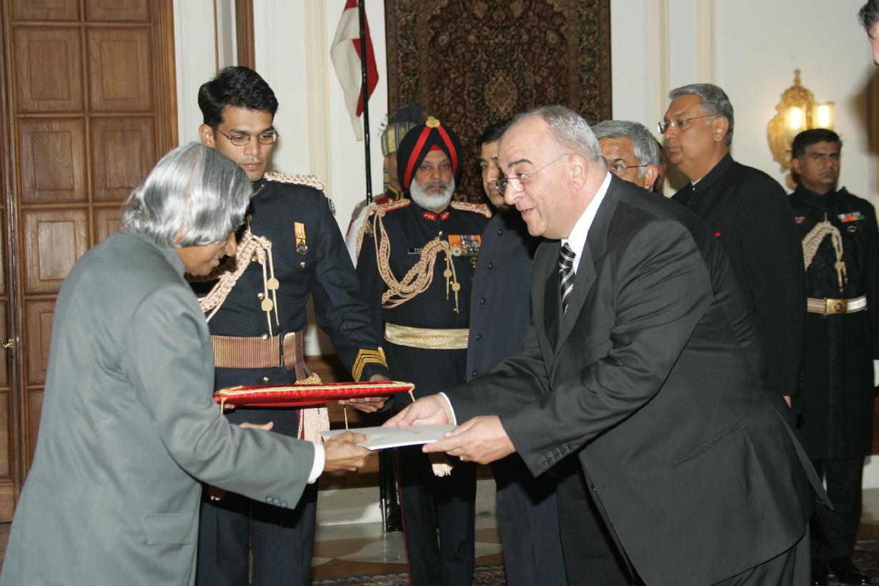 | Caption: | The Ambassador-Designate of the Kingdom of Jordon to India, HE Mr Mohamed Ali Daher Nsour presenting his credentials to the President of India, Dr A P J Abdul Kalam at the Yellow Drawing Room of at Rashtrapati Bhavan in New Delhi on Dec 08, 2005 |