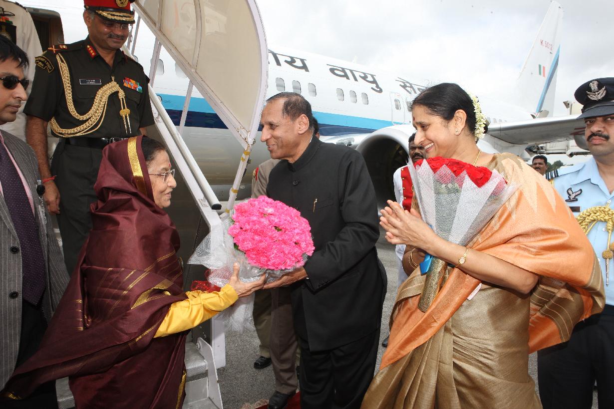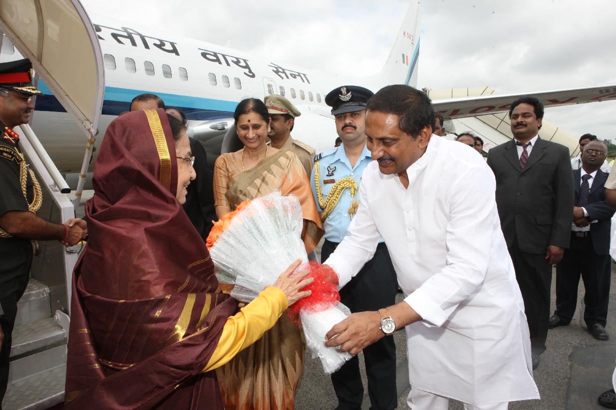 | Caption: | The President of India, Smt Pratibha Devisingh Patil being welcomed by the Governor of Andhra Pradesh, Shri E S L Narasimhan and the Chief Minister of Andhra Prdaesh, Shri N Kiran Kumar Reddy at Hyderabad Airport in Andhra Pradesh on Sep 04, 2011 |