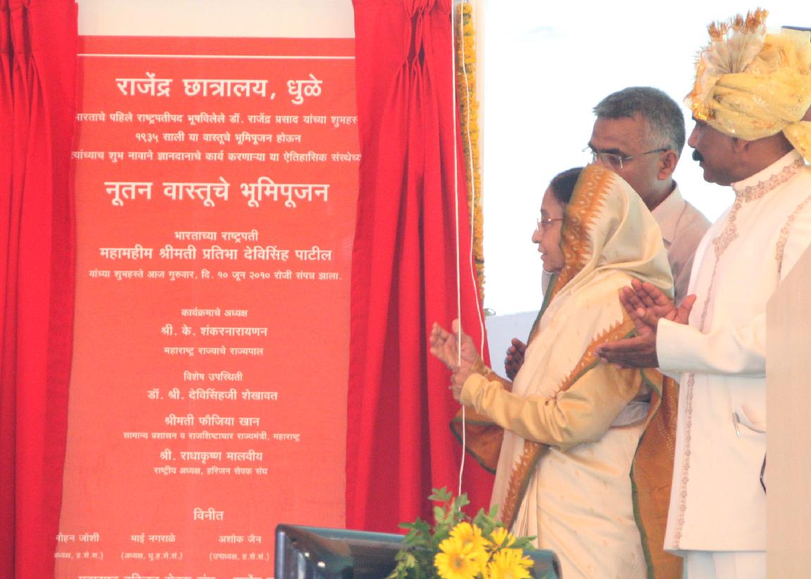 | Caption: | The President of India, Smt Pratibha Devisingh Patil during unveil the Plaque to lay the Foundation Stone of New Building of Rajendra Chhatralaya at the Platinum Jubilee of Maharashtra Harijan Sevak & Rajendra Chhatralaya & Itihasacharya Rajwade Sanshodhan Mandal Dhule at Dhule in Maharashtra on June 10, 2010 |