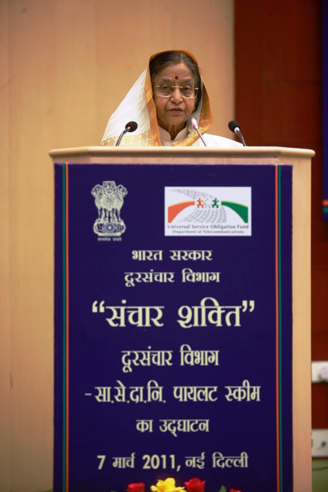 | Caption: | The President of India, Smt Pratibha Devisingh Patil during the inauguration of Department of Telecommunications Pilot Project Scheme for Mobile Value Added Services & ICT Related Livelihood Skills for Women's Self Help Group at Vigyan Bhavan in New Delhi on March 07, 2011 |