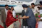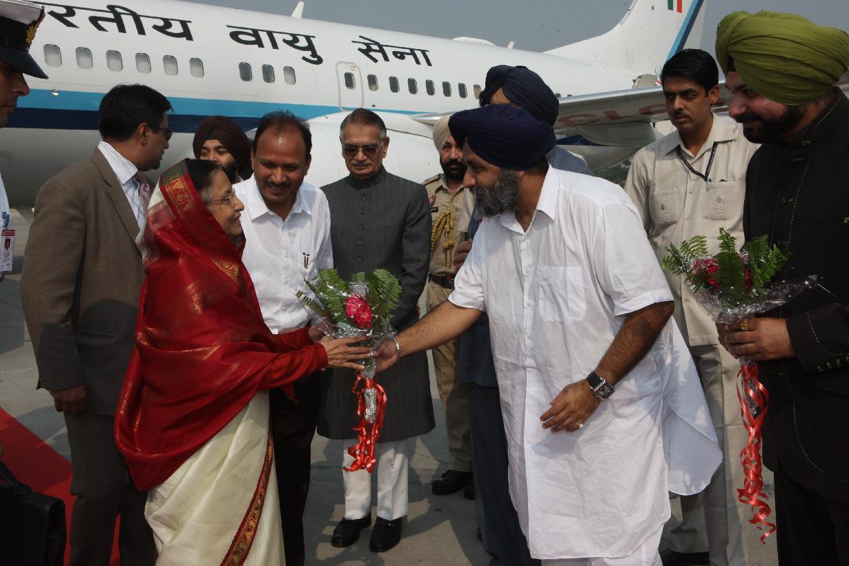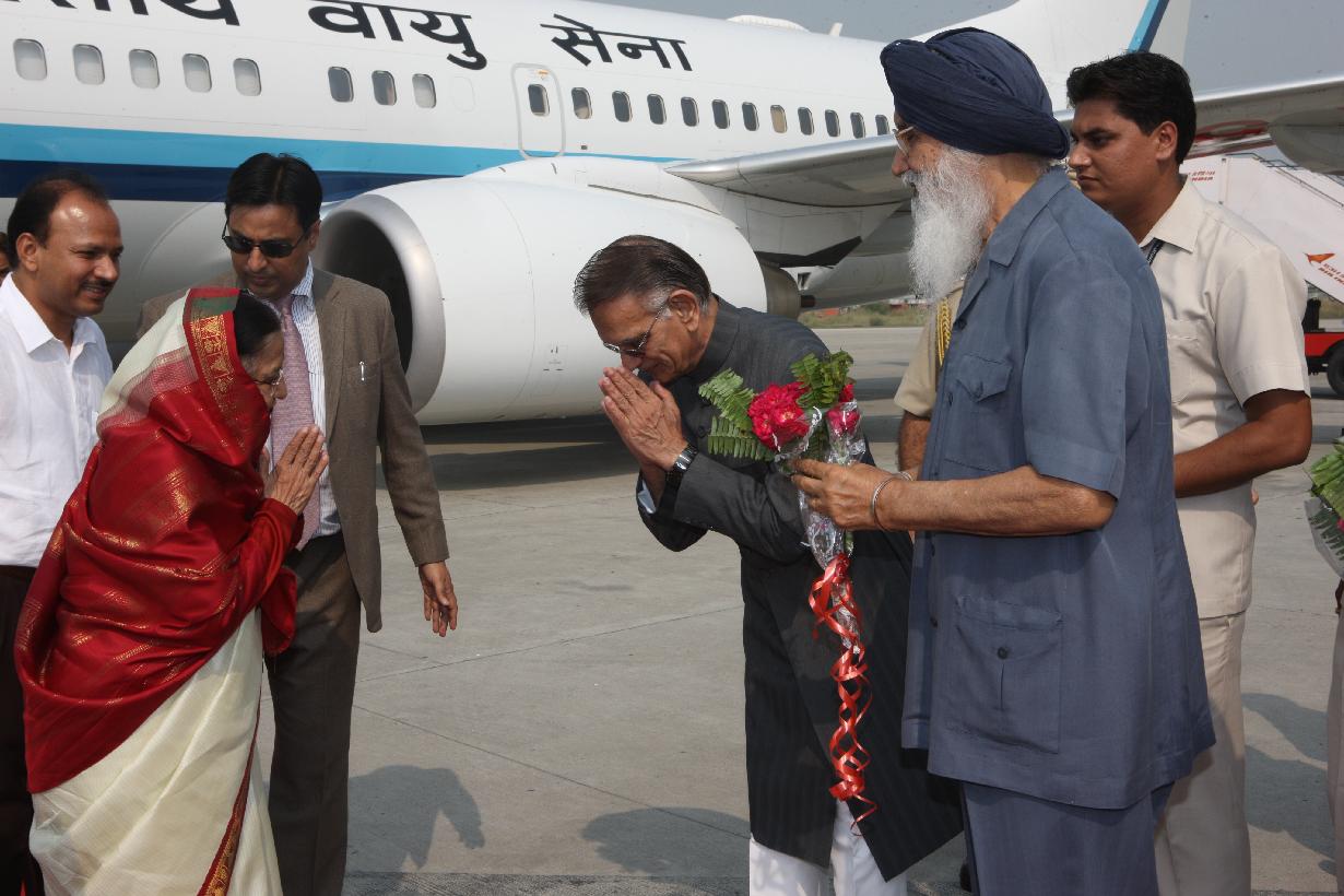 | Caption: | The President of India, Smt Pratibha Devisingh Patil being welcomed by the Governor of Punjab, Shri Shivraj Patil and Chief Minister of Punjab, Shri Parkash Singh Badal at Amritsar Airport in Punjab on Oct 06, 2010 |