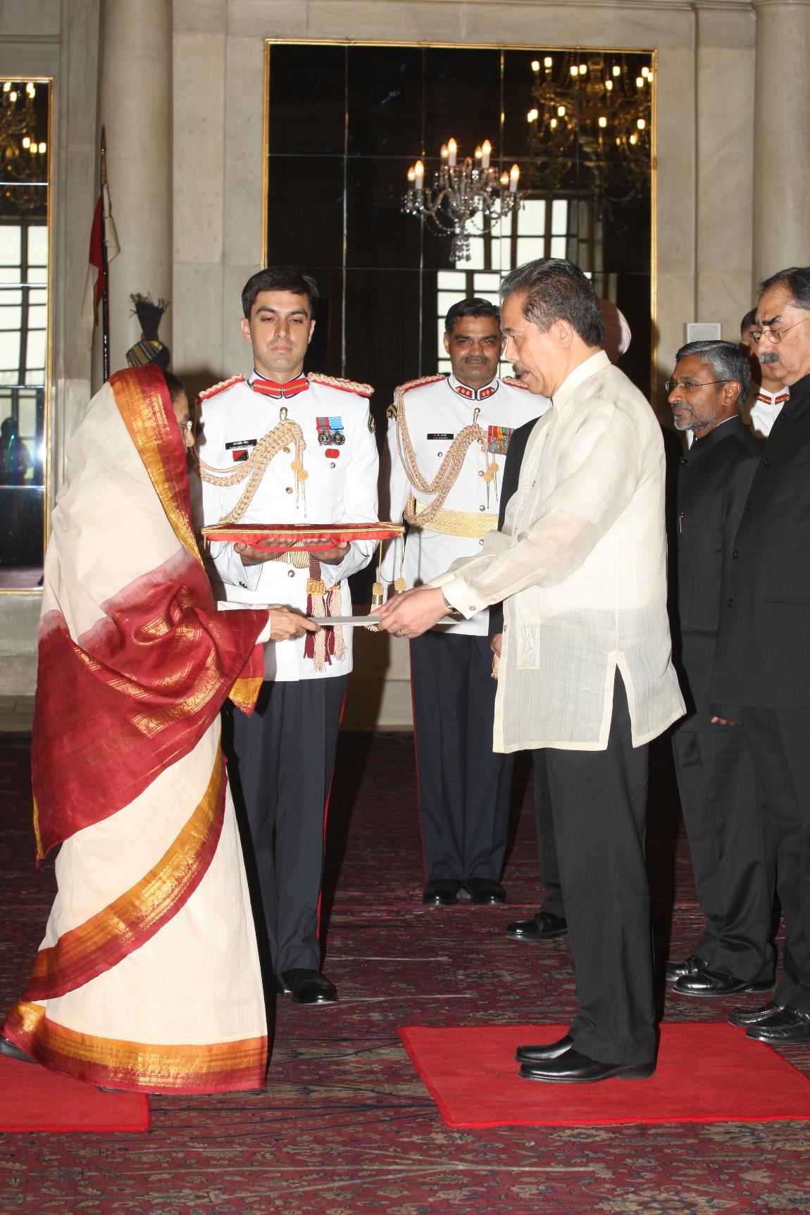 | Caption: | The Ambassador Designate of Philippines, HE Mr Ronald B Allarey presenting his credentials to the President of India, Smt Pratibha Devisingh Patil at Rashtrapati Bhavan in New Delhi on June 30, 2010 |