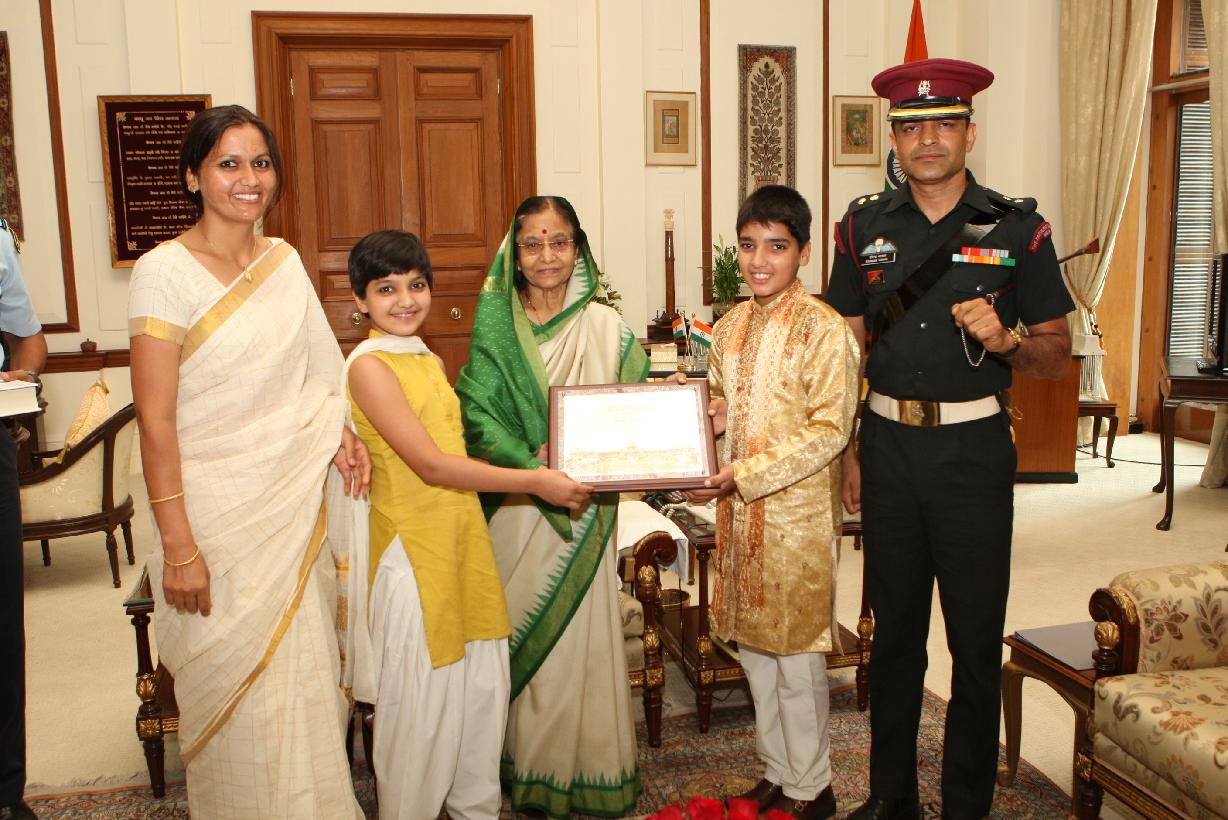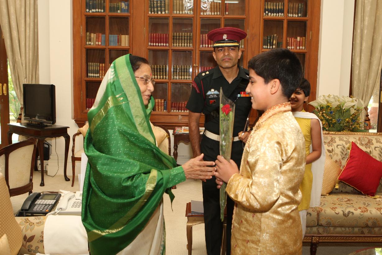 | Caption: | The President of India, Smt Pratibha Devisingh Patil at the farewell Call by Lt Col Ravinder Narwal and Family at Rashtrapati Bhavan in New Delhi on June 25, 2010 |
