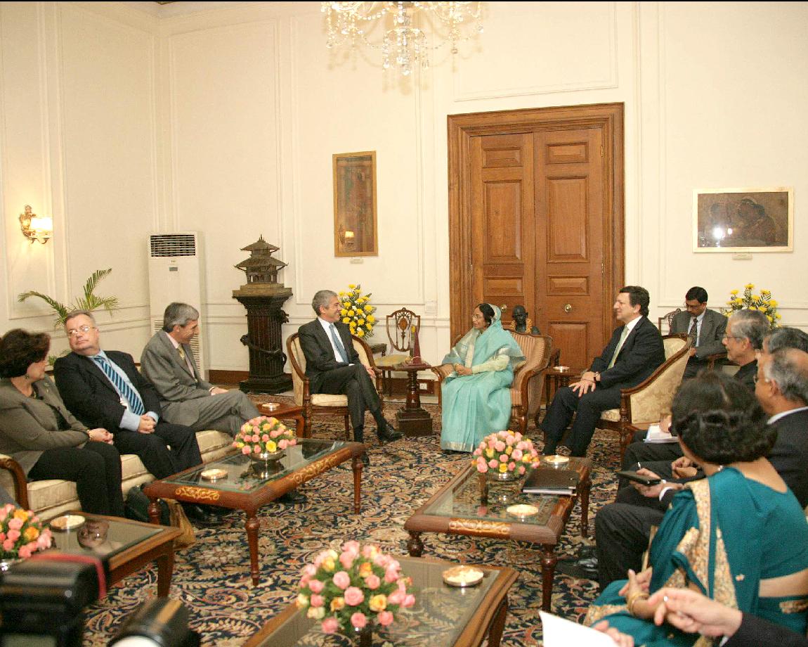| Caption: | The President of the European Commission, HE Mr Jose Manuel Barroso and the Prime Minister of the Republic of Portugal, HE Mr Jose Socrates calling on the President of India, Smt Pratibha Devisingh Patil at Rashtrapati Bhavan in New Delhi on Nov 30, 2007 |