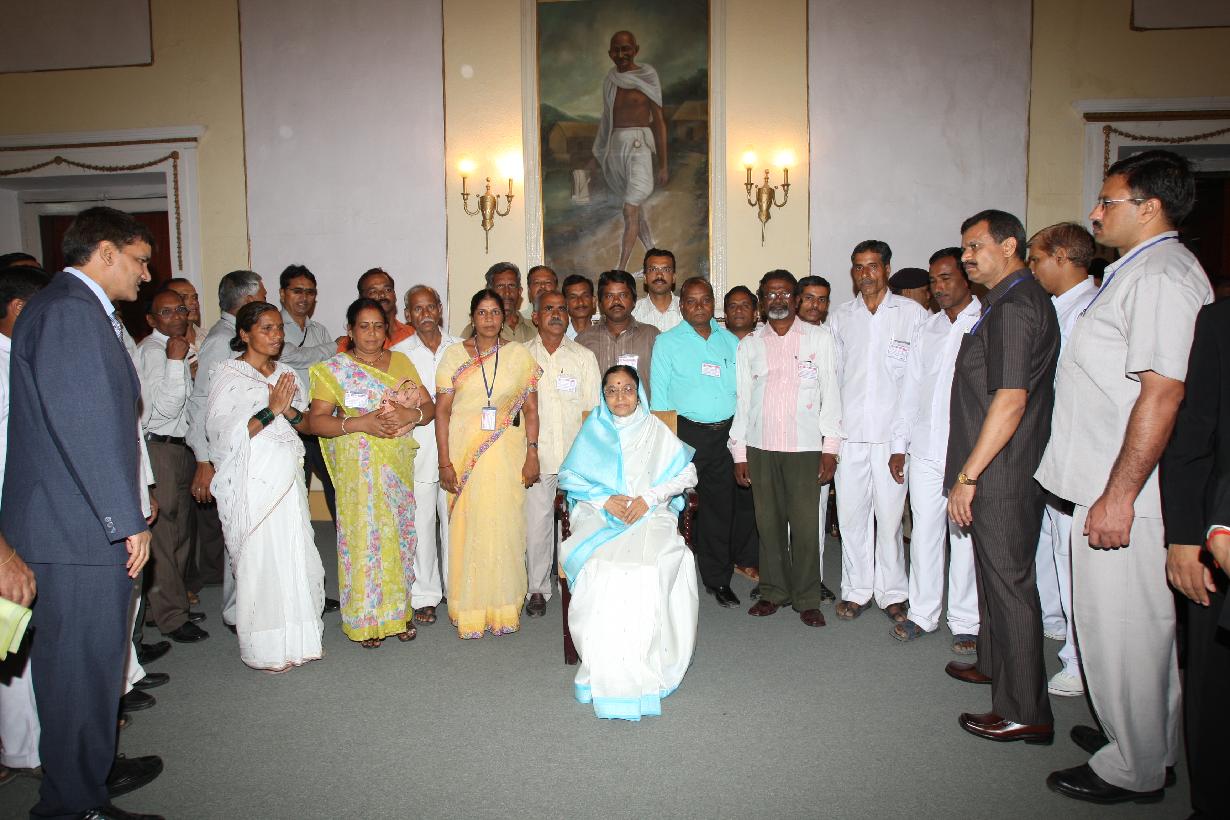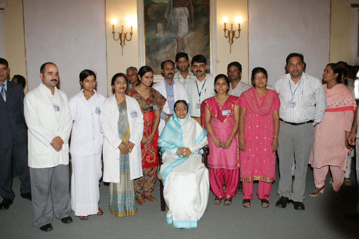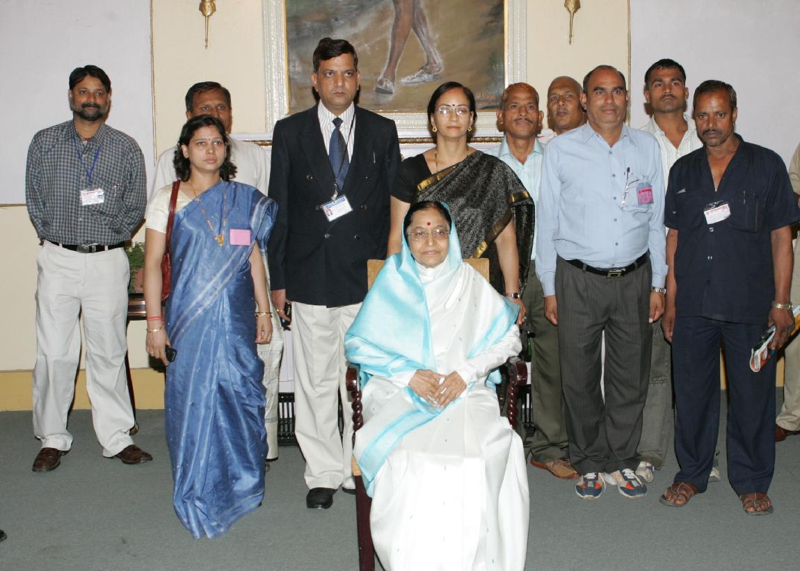 | Caption: | The President of India, Smt Pratibha Devisingh Patil posing for a Group Photographs with Staffs of Governor Residency of Indore in Madhya Pradesh on June 29, 2008 |