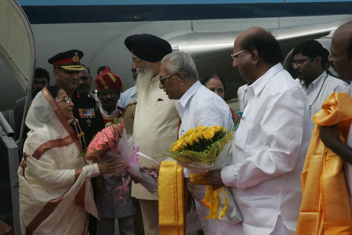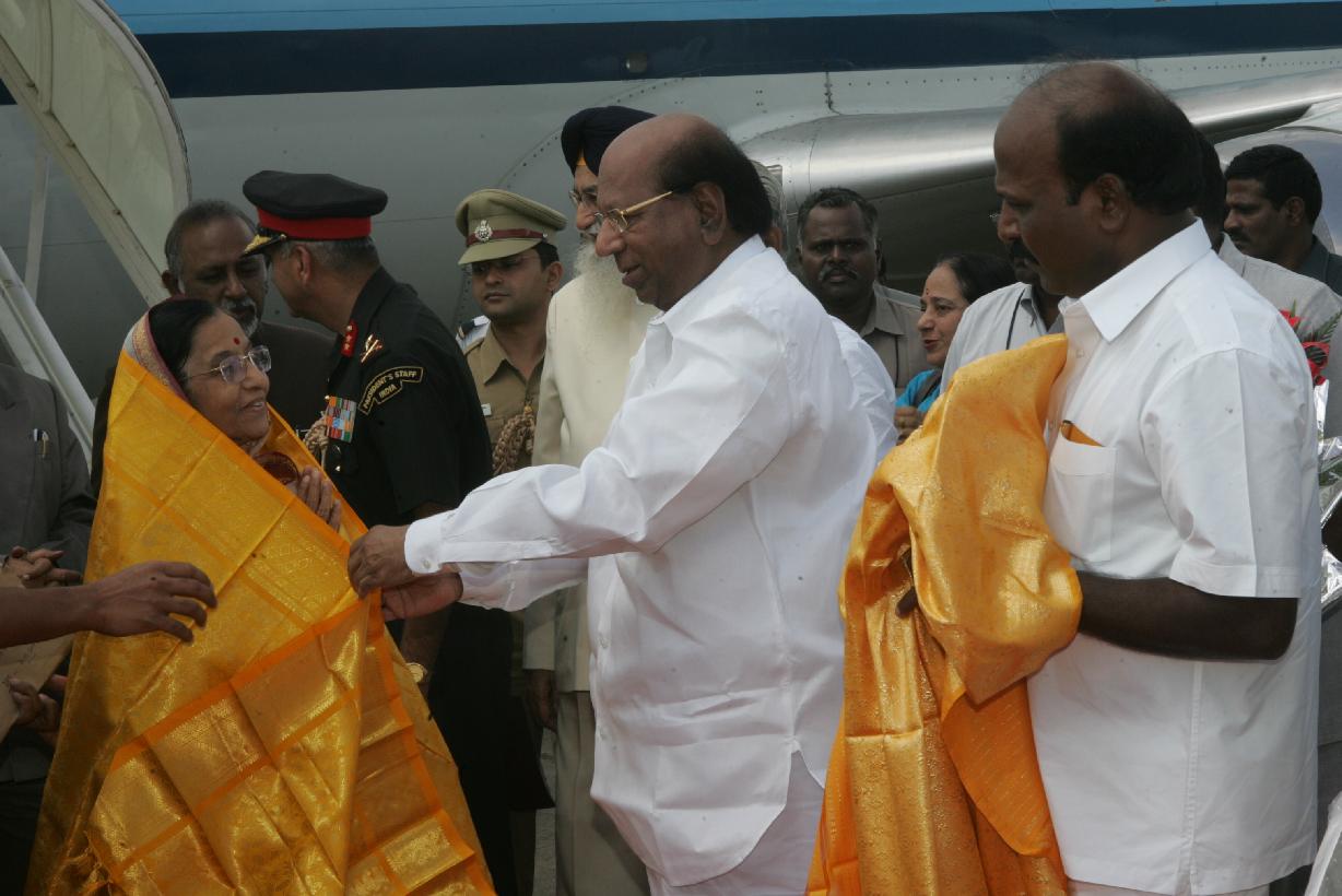 | Caption: | The President of India, Smt Pratibha Devisingh Patil being welcomed by the Governor of Tamil Nadu, Shri Surjit Singh Barnala at Chennai Airport in Tamil Nadu on Nov 02, 2007 |
