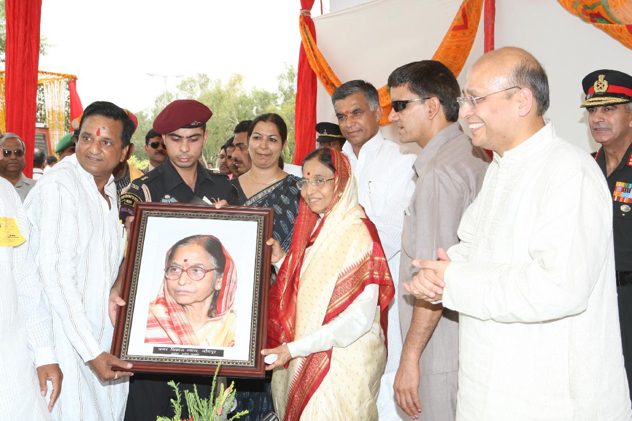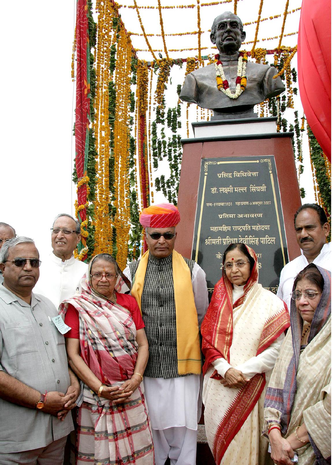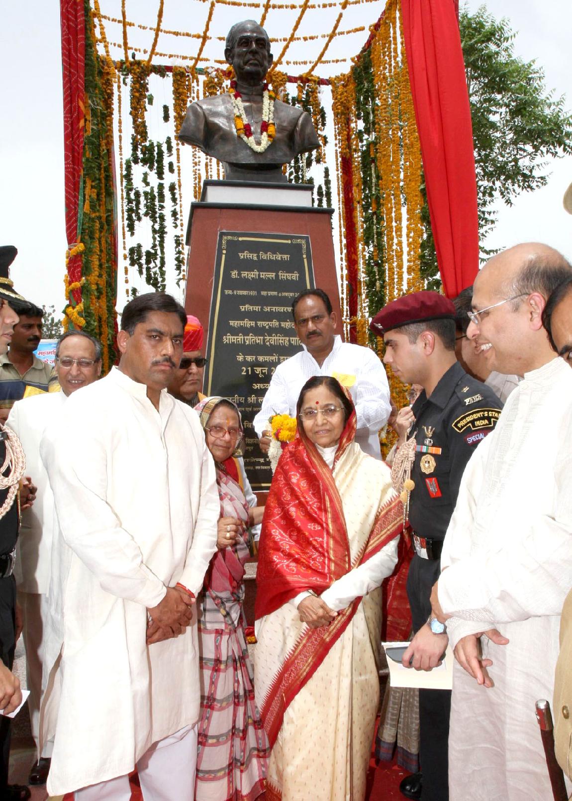 | Caption: | The President of India, Smt Pratibha Devisingh Patil unveiling the Statue of Dr L M Singhvi at Jodhpur in Rajasthan on June 21, 2008 |