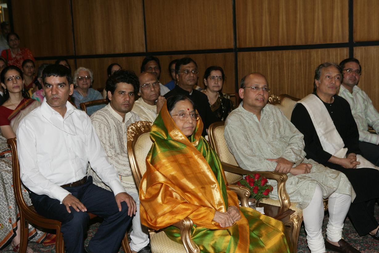 | Caption: | The President of India, Smt Pratibha Devisingh Patil witnessing the Rudra Veena and Saraswati Veena Recital Performed by Ustad Asad Ali Khan, Saraswati Rajagopalan and Kumari Veena Venkataramani at Art Theatre of Rashtrapati Bhavan in New Delhi on Oct 21, 2007 |