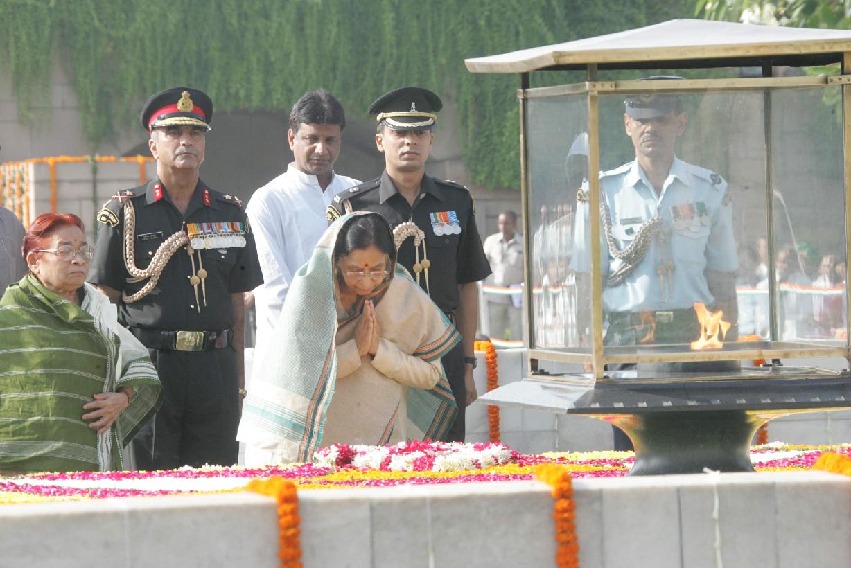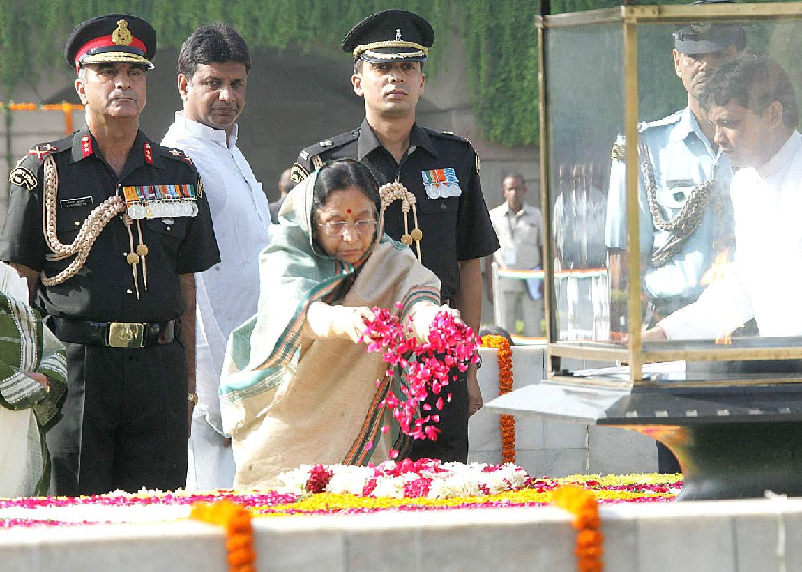 | Caption: | The President of India, Smt Pratibha Devisingh Patil paying homage at the Samadhi of the Father of Nation, Mahatma Gandhi on the occasion of his 138th Birth Anniversary at Rajghat in New Delhi on Oct 02, 2007 |