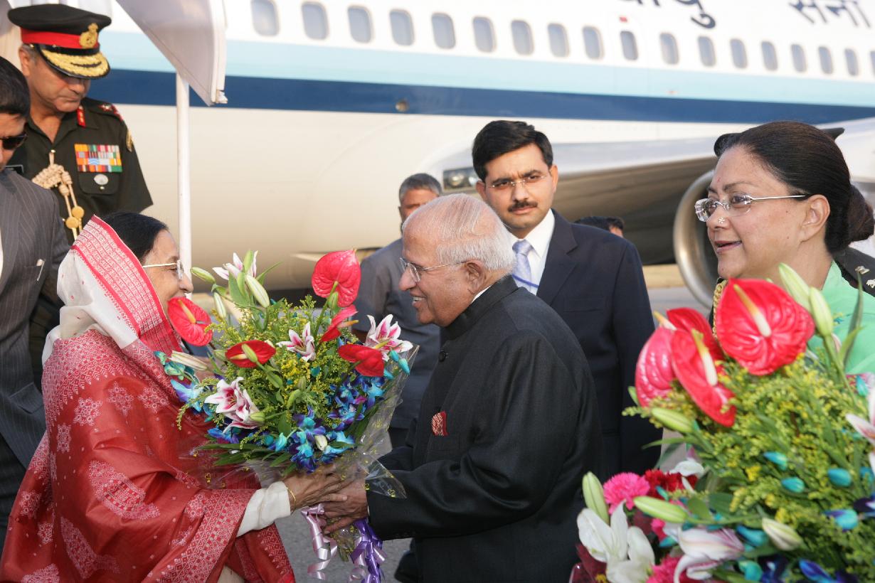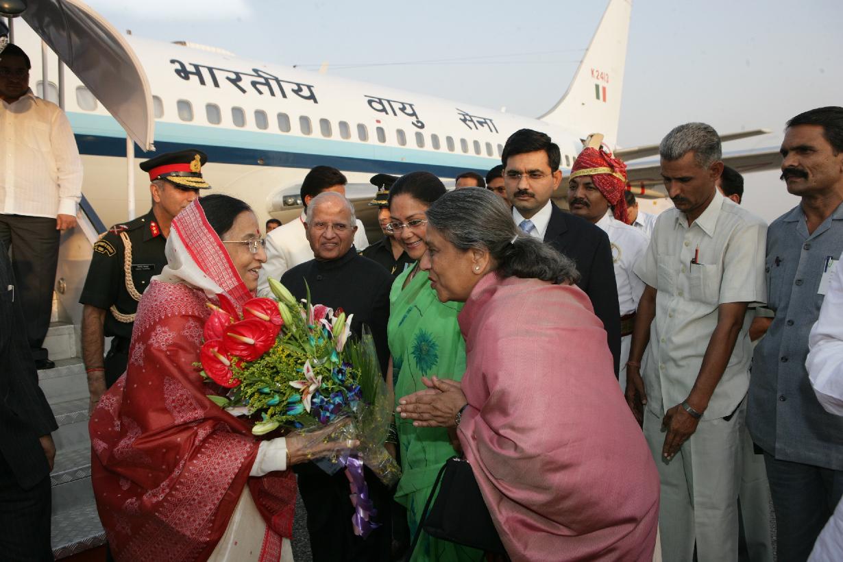| Caption: | The President of India, Smt Pratibha Devisingh Patil being welcomed by the Governor of Rajasthan, Shri S K Singh and Chief Minister of Rajasthan, Smt Vasundhara Raje at Jaipur Airport in Rajasthan on Oct 28, 2007 |