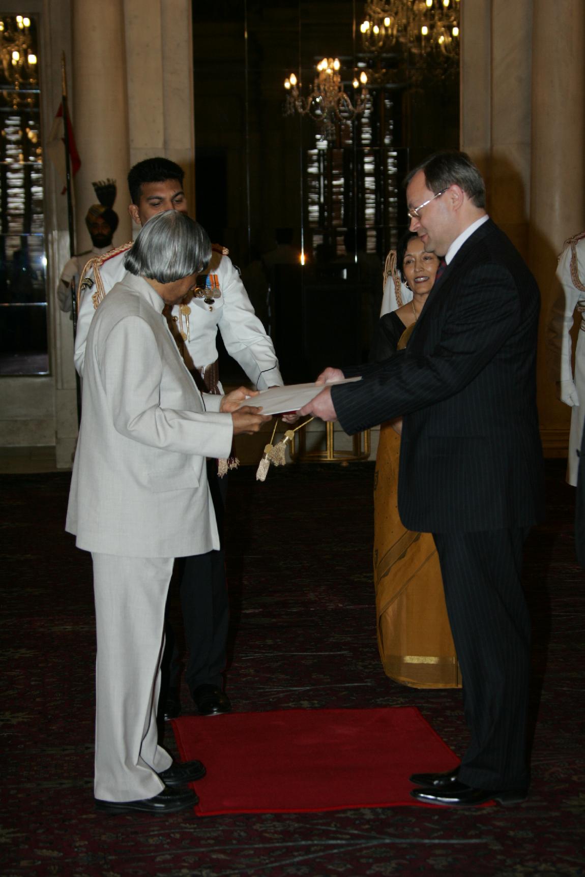 | Caption: | The Ambassador-Designate of Republic of Belarus to India, HE Mr Oleg Laptenok presenting his credentials to the President of India, Dr A P J Abdul Kalam at the Ashok Hall of Rashtrapati Bhavan in New Delhi on April 26, 2005 |