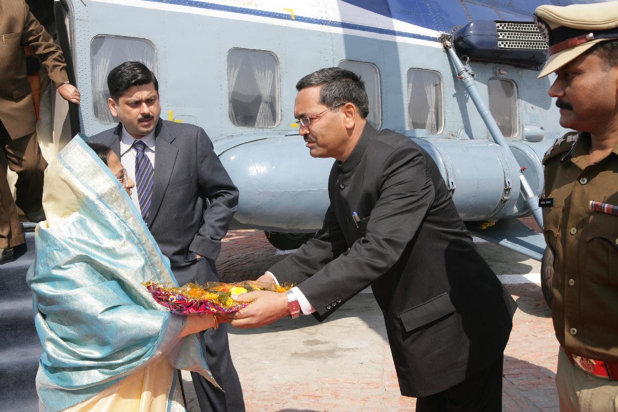 | Caption: | The President of India, Smt Pratibha Devisingh Patil during her arrival at Nalanda Helipad in Bihar on Feb 15, 2008 |