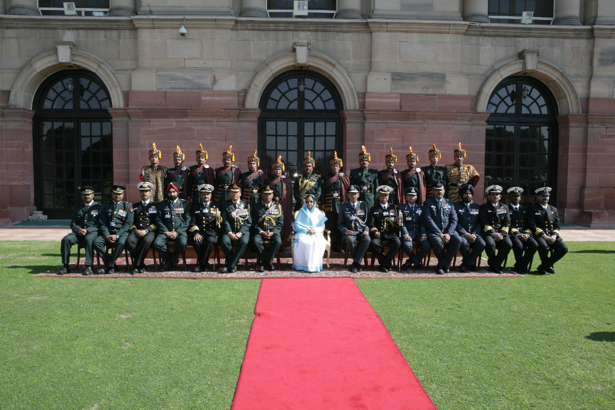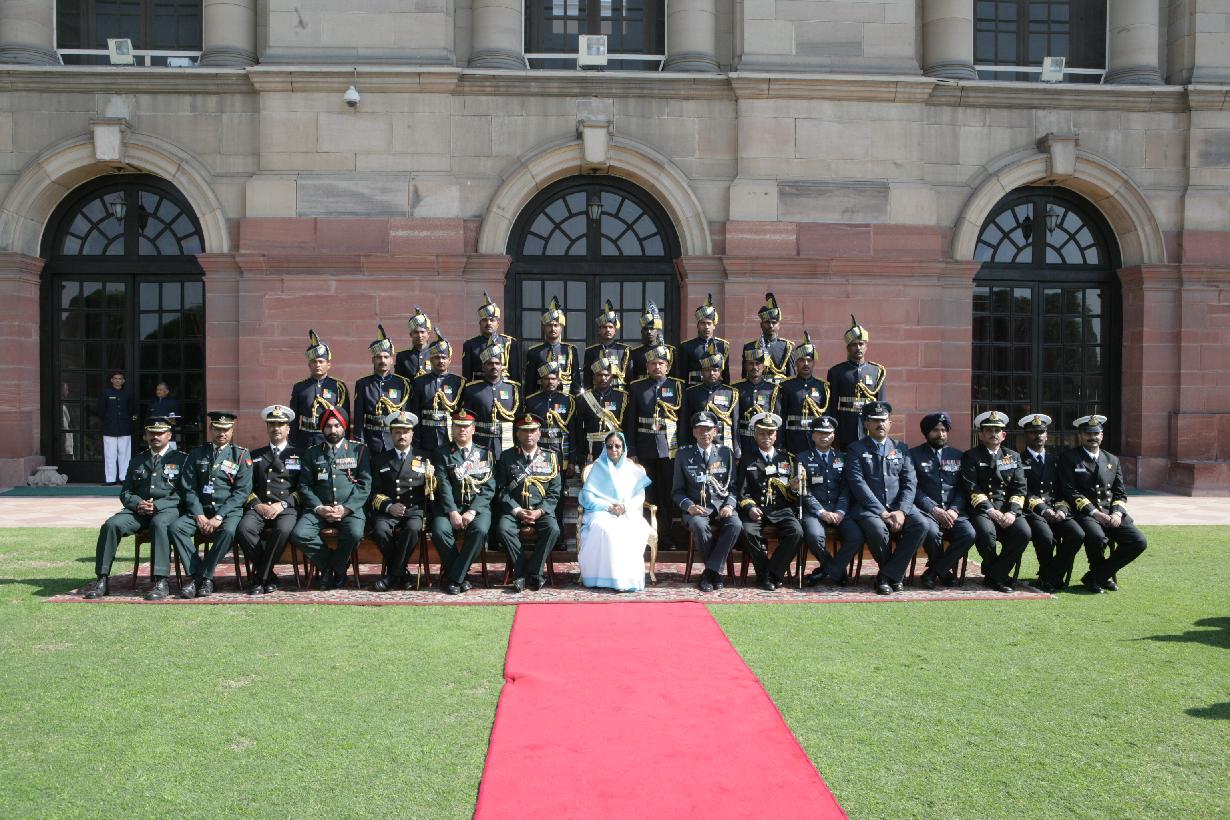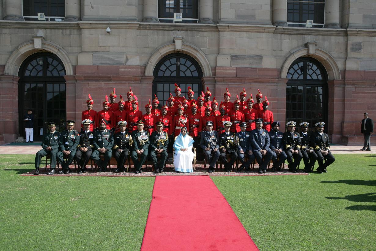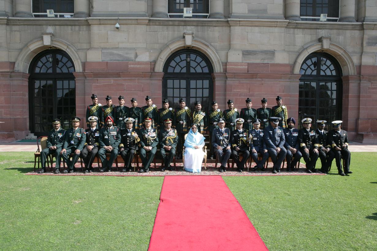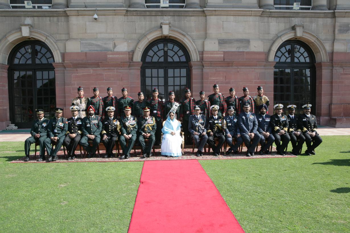 | Caption: | The President of India, Smt Pratibha Devisingh Patil posing for a Group Photo with Tri Service Band Contingents at Rashtrapati Bhavan in New Delhi on Jan 30, 2009 |