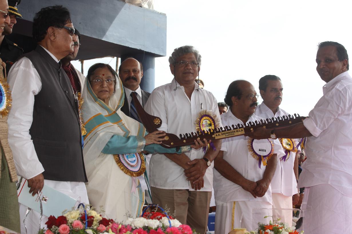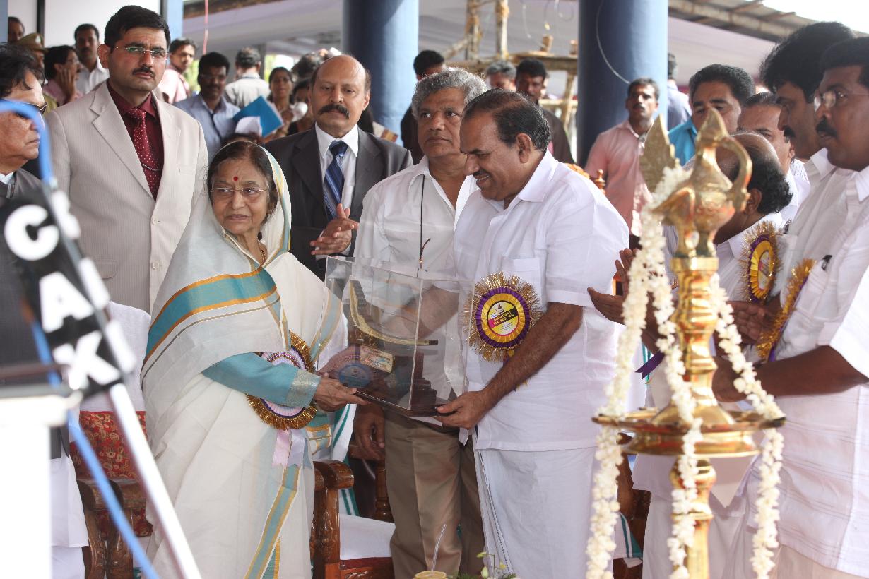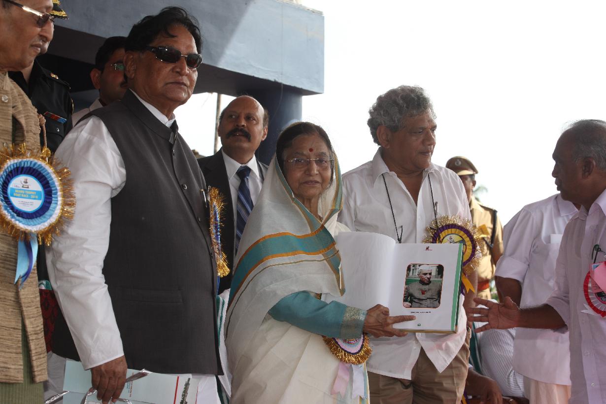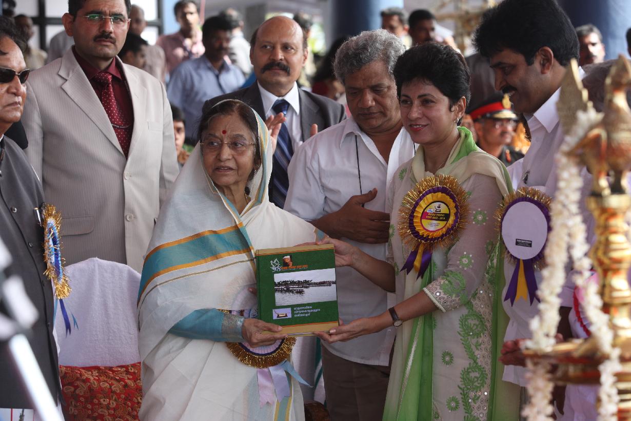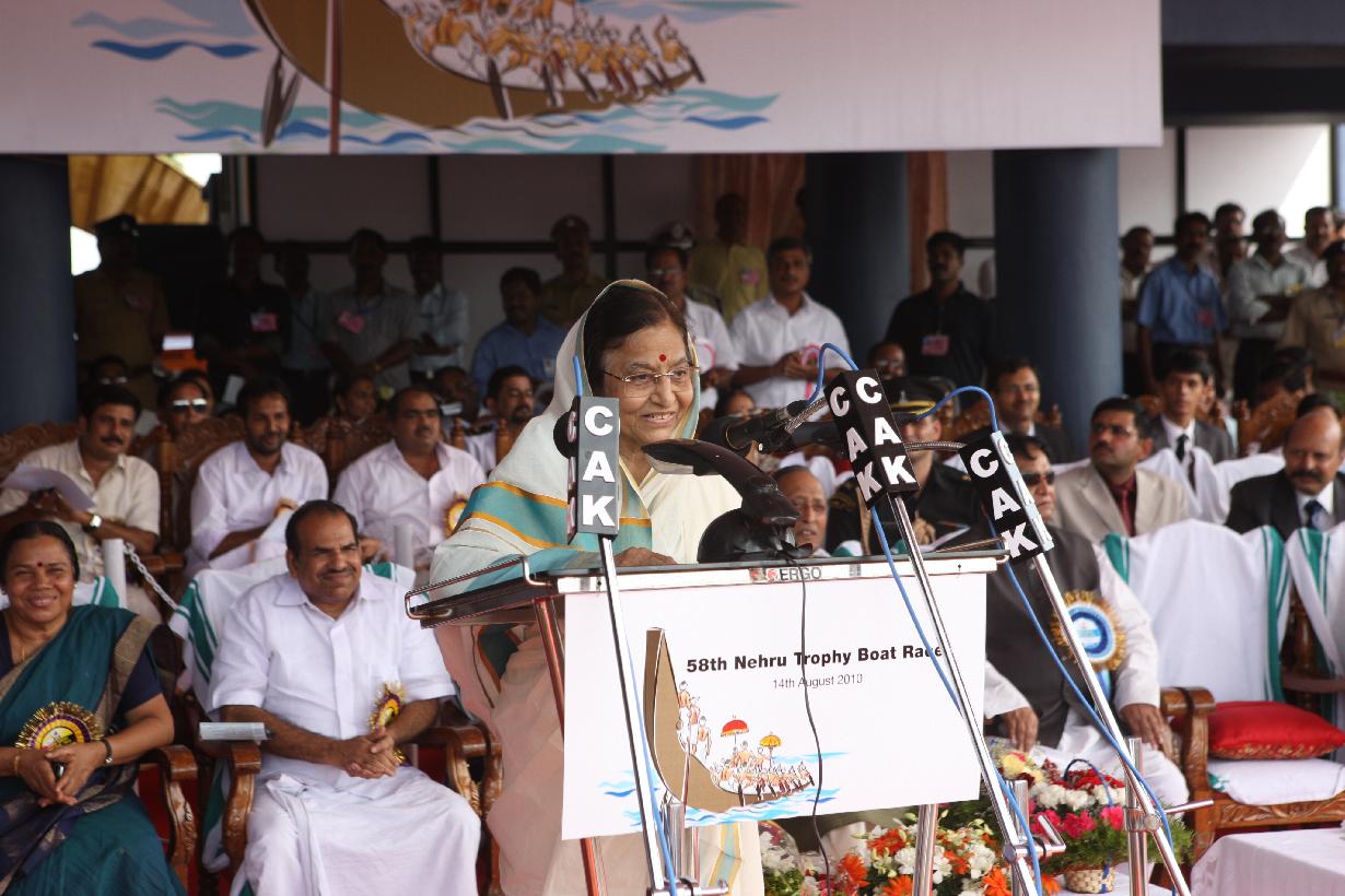 | Caption: | The President of India, Smt Pratibha Devisingh Patil receiving a copy of the Souvenir after its release, from the Union Minister of Tourism, Kumari Selja on the occasion of the Nehru Trophy Boat Race at Punnamada Lake, Alappuzha in Kerala on Aug 14, 2010 |