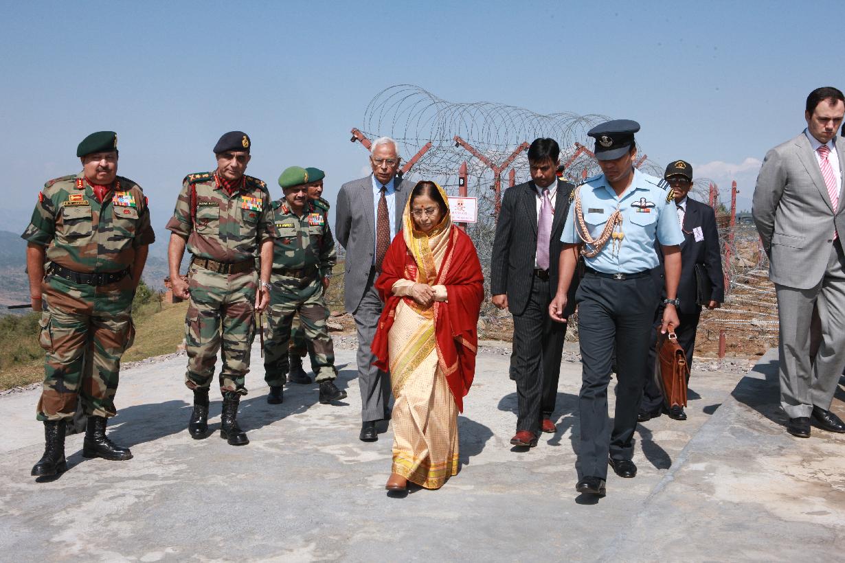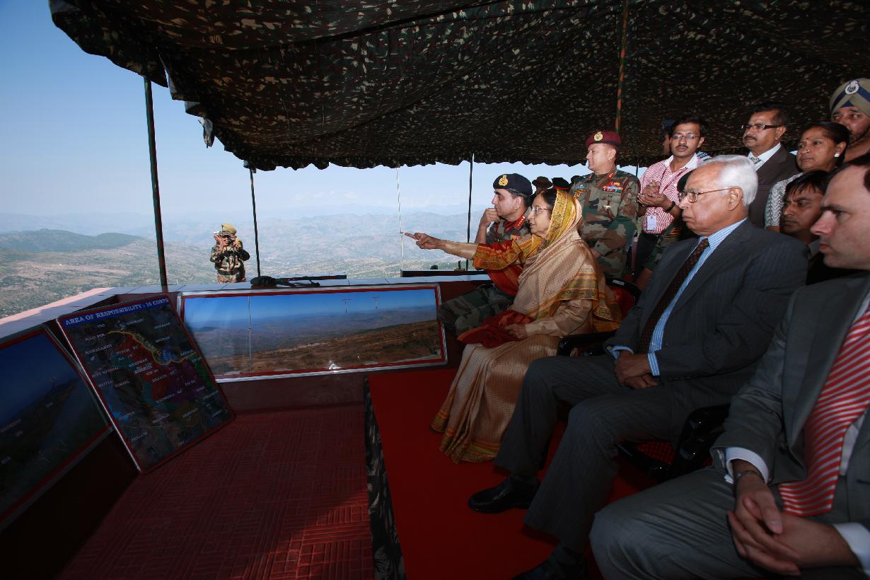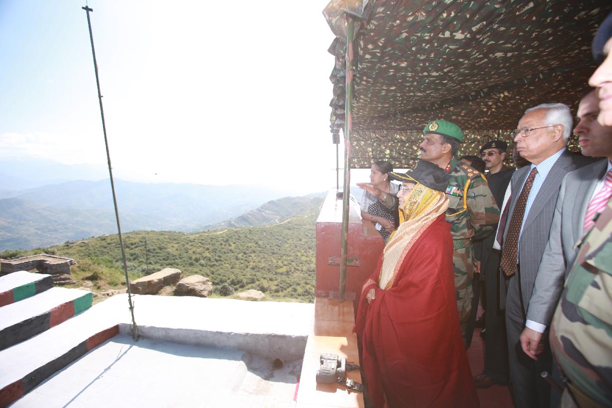 | Caption: | The President of India, Smt Pratibha Devisingh Patil taking a look at the LOC at a Forward Post near Rajouri during her visit to Jammu and Kashmir on Oct 09, 2009 |