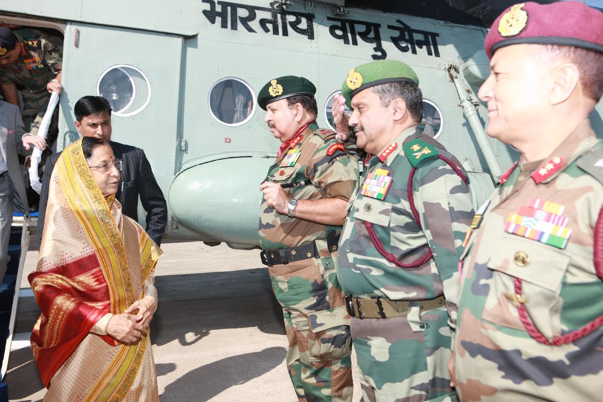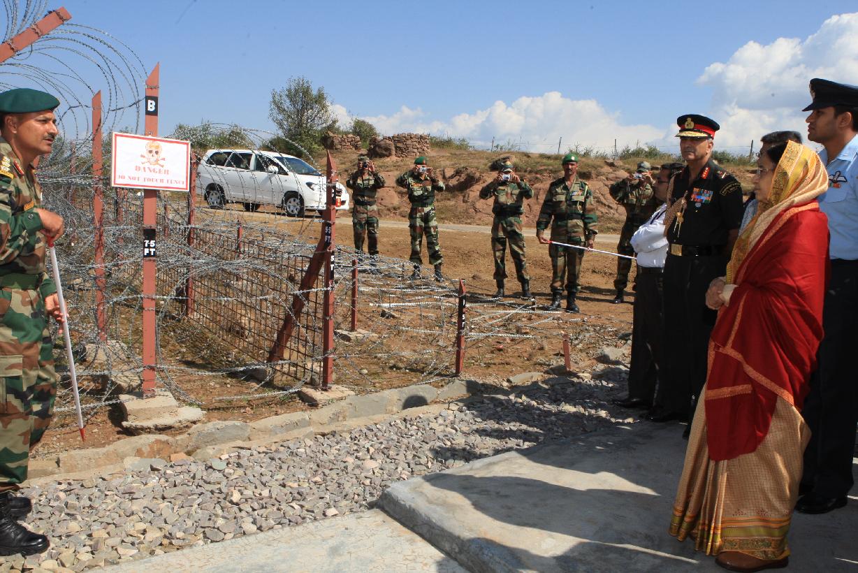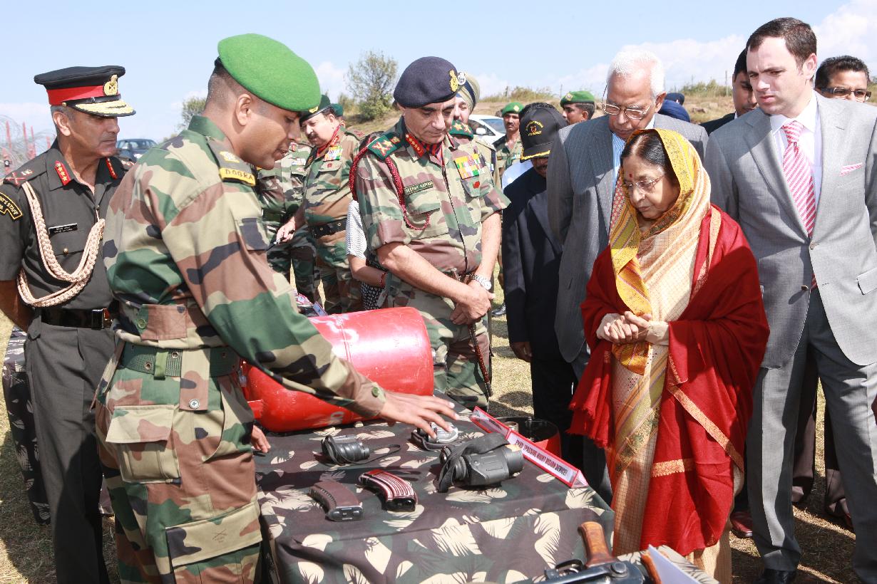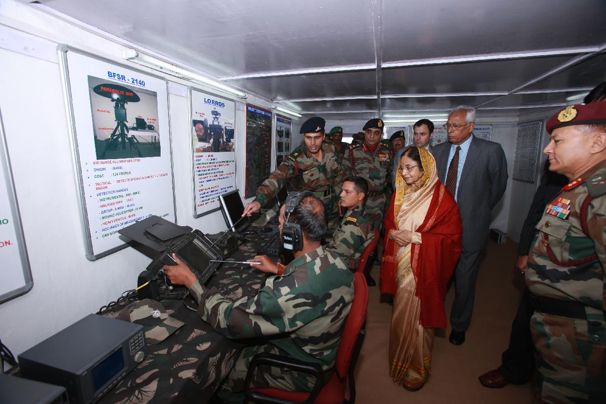 | Caption: | The President of India, Smt Pratibha Devisingh Patil taking a look at the LOC at a Forward Post near Rajouri during her visit to Jammu and Kashmir on Oct 09, 2009 |