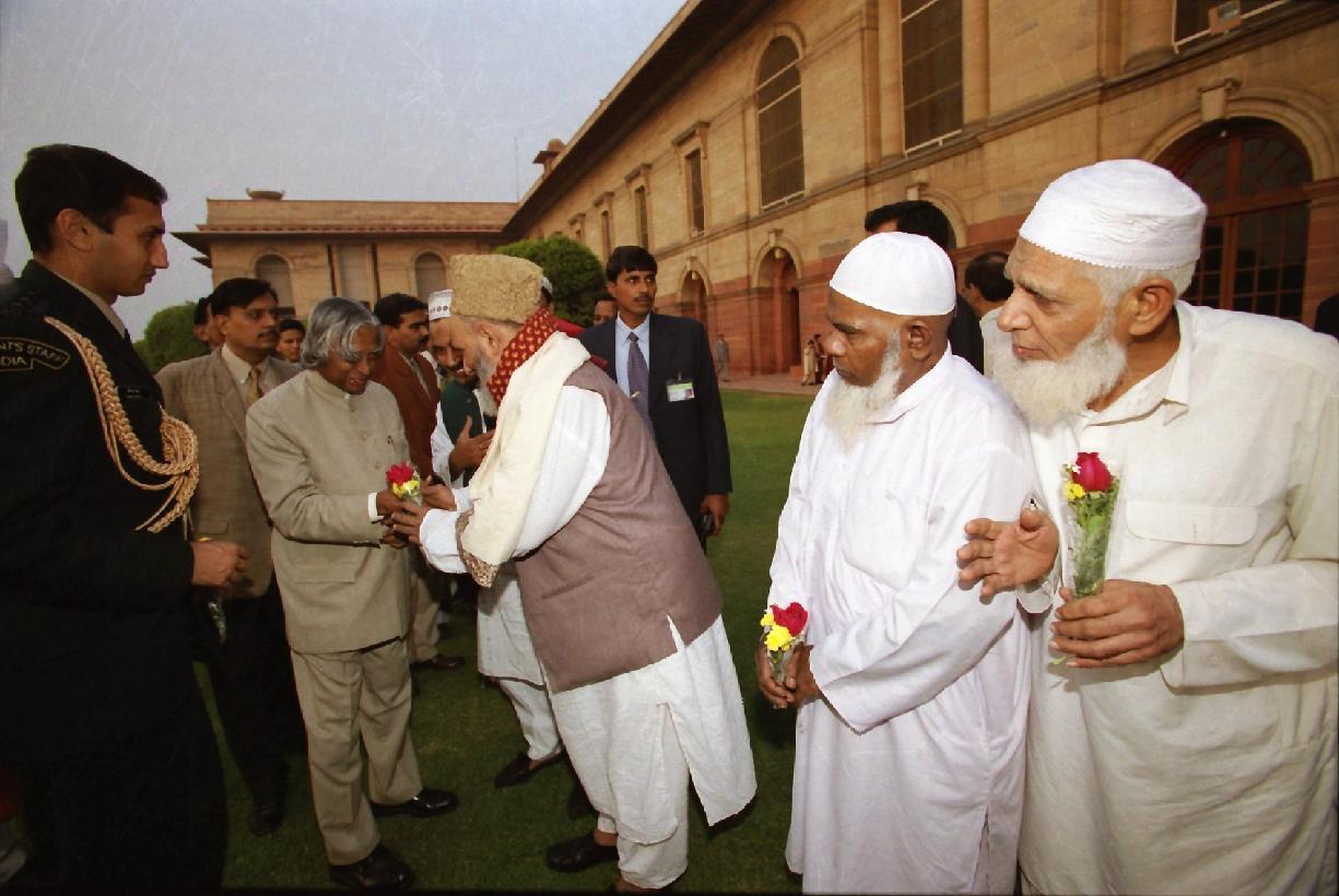 | Caption: | The President of India, Dr A P J Abdul Kalam receiving Idu'l Fitr Greetings from VVIP People at Rashtrapati Bhavan in New Delhi on Dec 06, 2002 |