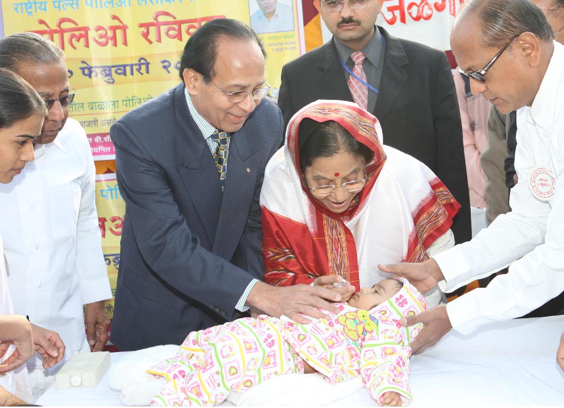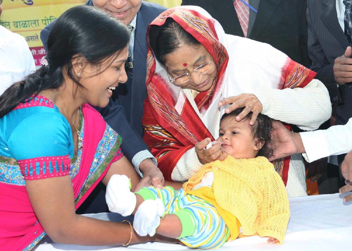 | Caption: | The President of India, Smt Pratibha Devisingh Patil administering the Polio Drops to Children at the Pulse Polio Immunisation Camp at Jalgaon in Maharashtra on Feb 10, 2008 |