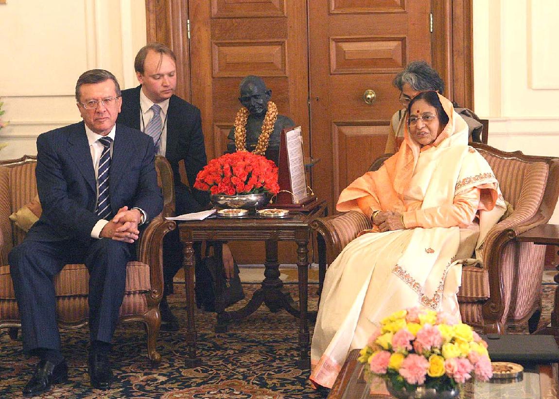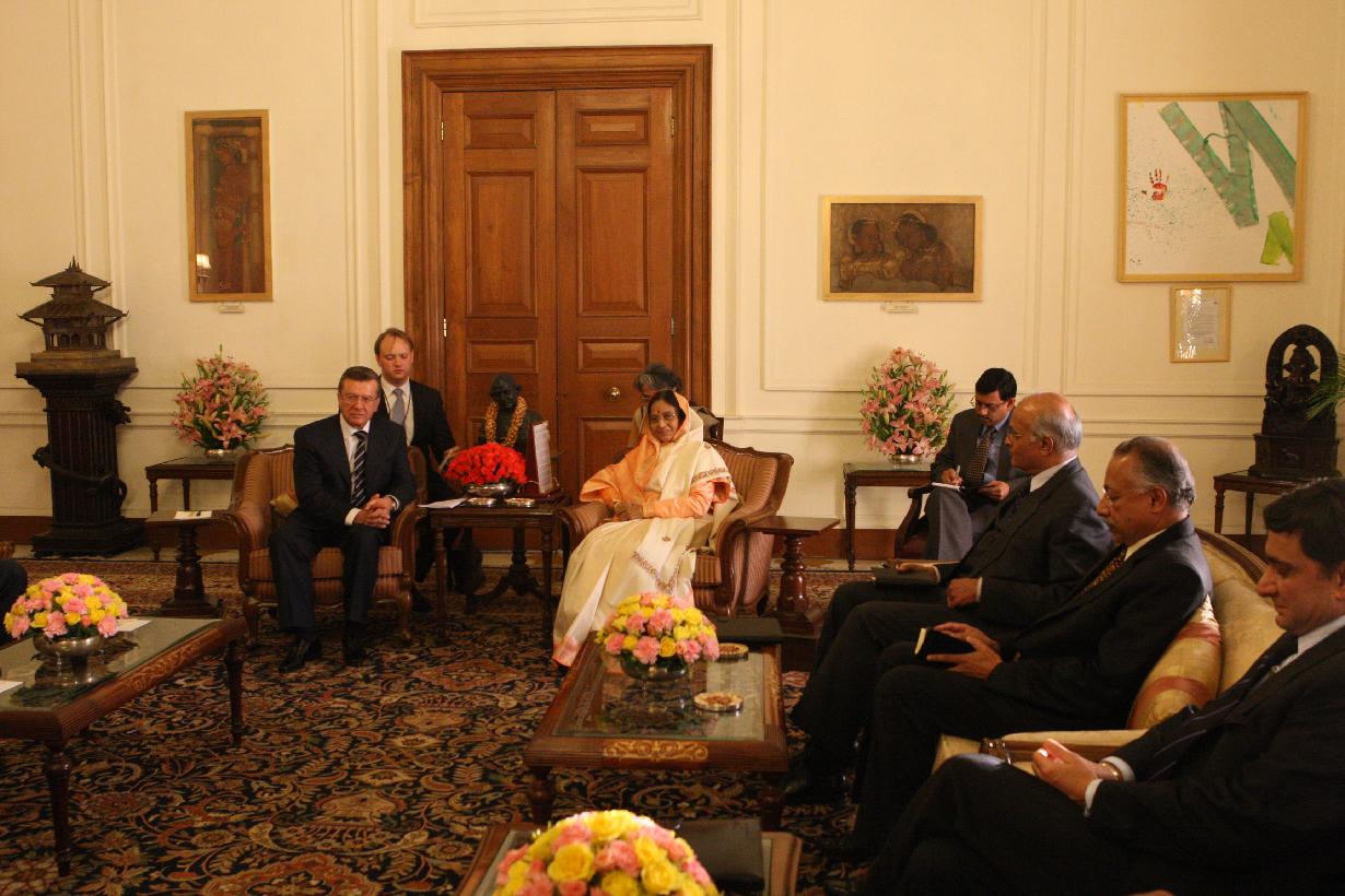 | Caption: | The Chairman of Russian Federation, HE Mr Victor A Zubkov calling on the President of India, Smt Pratibha Devisingh Patil at Rashtrapati Bhavan in New Delhi on Feb 12, 2008 |