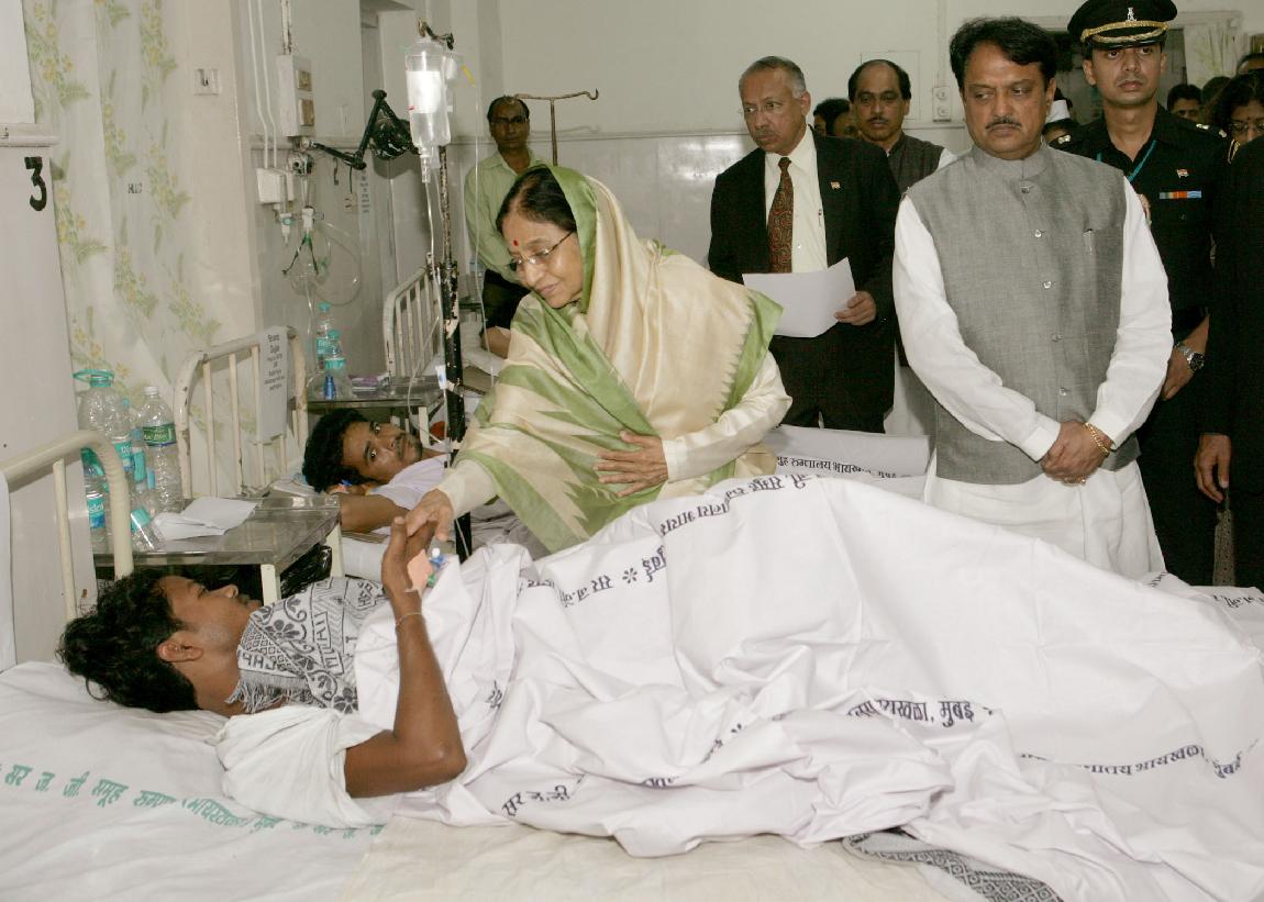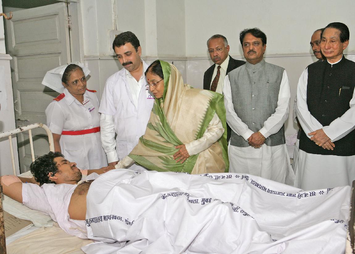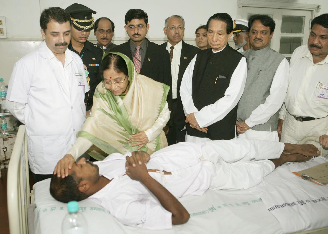 | Caption: | The President of India, Smt Pratibha Devisingh Patil consoling a Victim of the Mumbai Terrorist Attack during her Visit the J J Hospital at Mumbai in Maharashtra on Dec 01, 2008 |