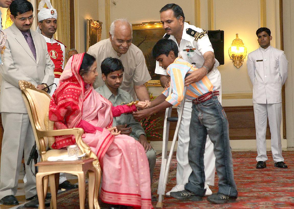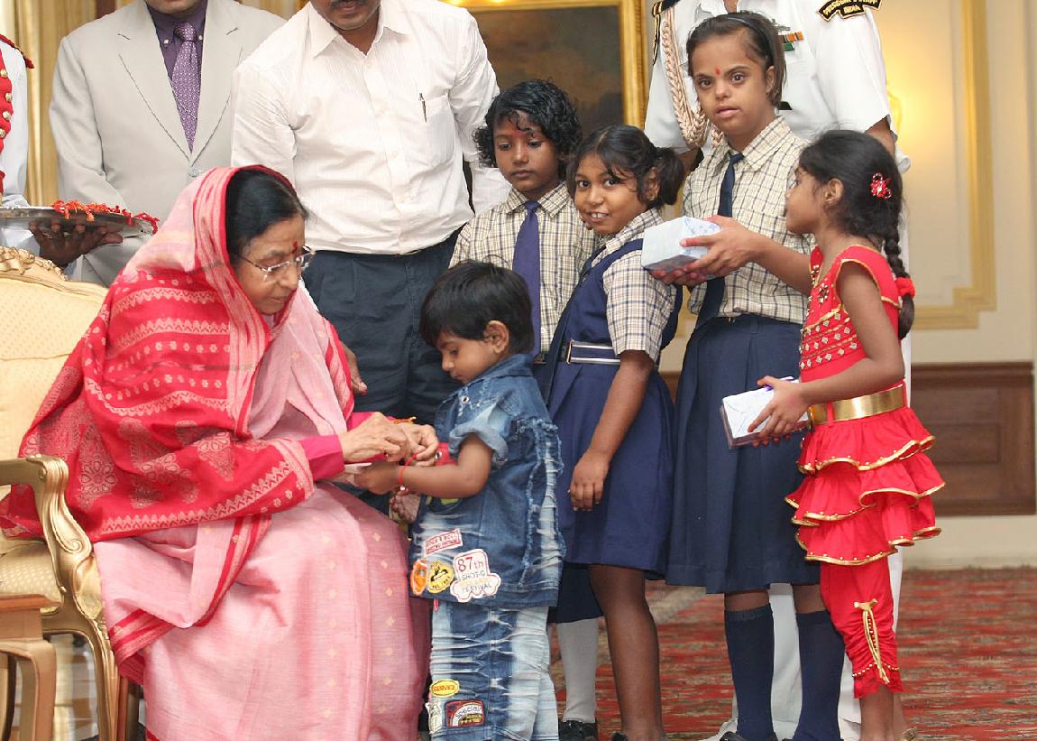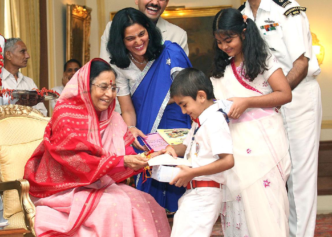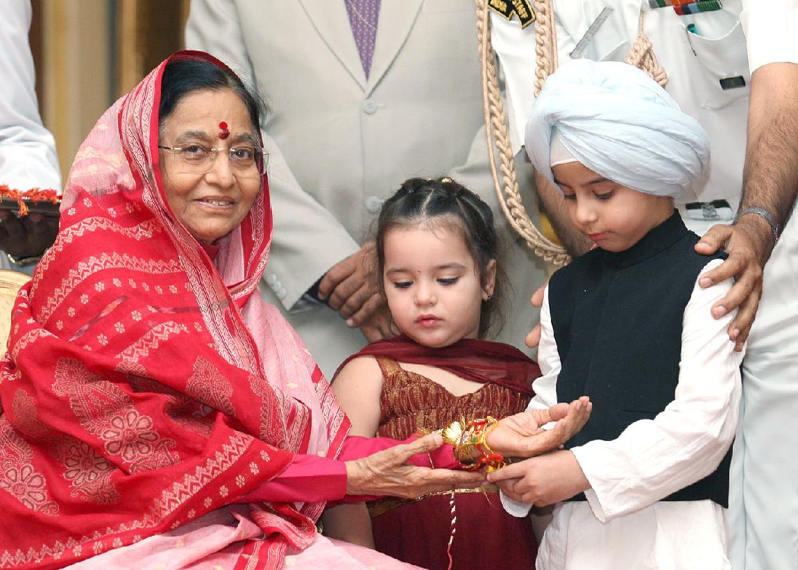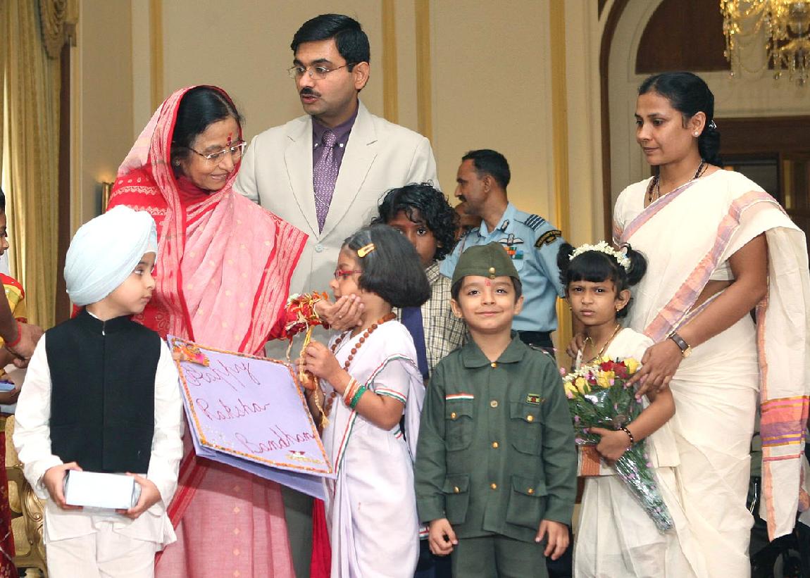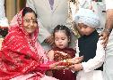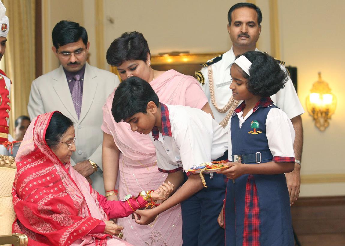 | Caption: | The President of India, Smt Pratibha Devisingh Patil being tied a Rakhi by children on the occasion of Raksha Bandhan at Rashtrapati Bhavan in New Delhi on Aug 16, 2008 |