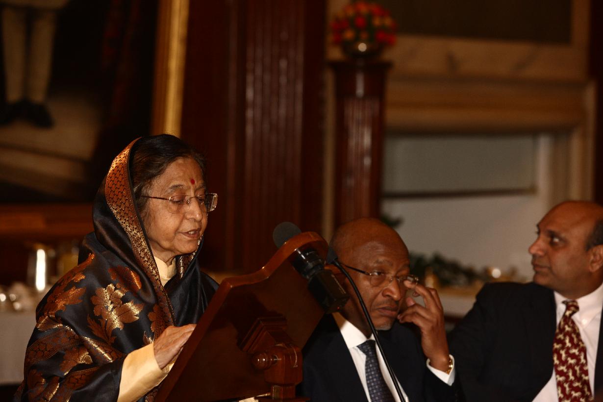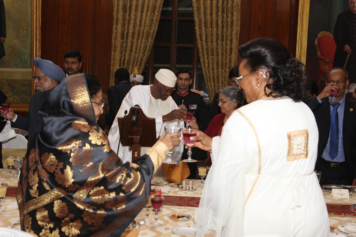 | Caption: | The President of India, Smt Pratibha Devisingh Patil at the Banquet Hosted in Honour of the President of the Republic of Mali, HE Mr Amadou Toumani Tour and his wife Mrs Toure Lobbo Ttraore at Rashtrapati Bhavan in New Delhi on Jan 11, 2012 |