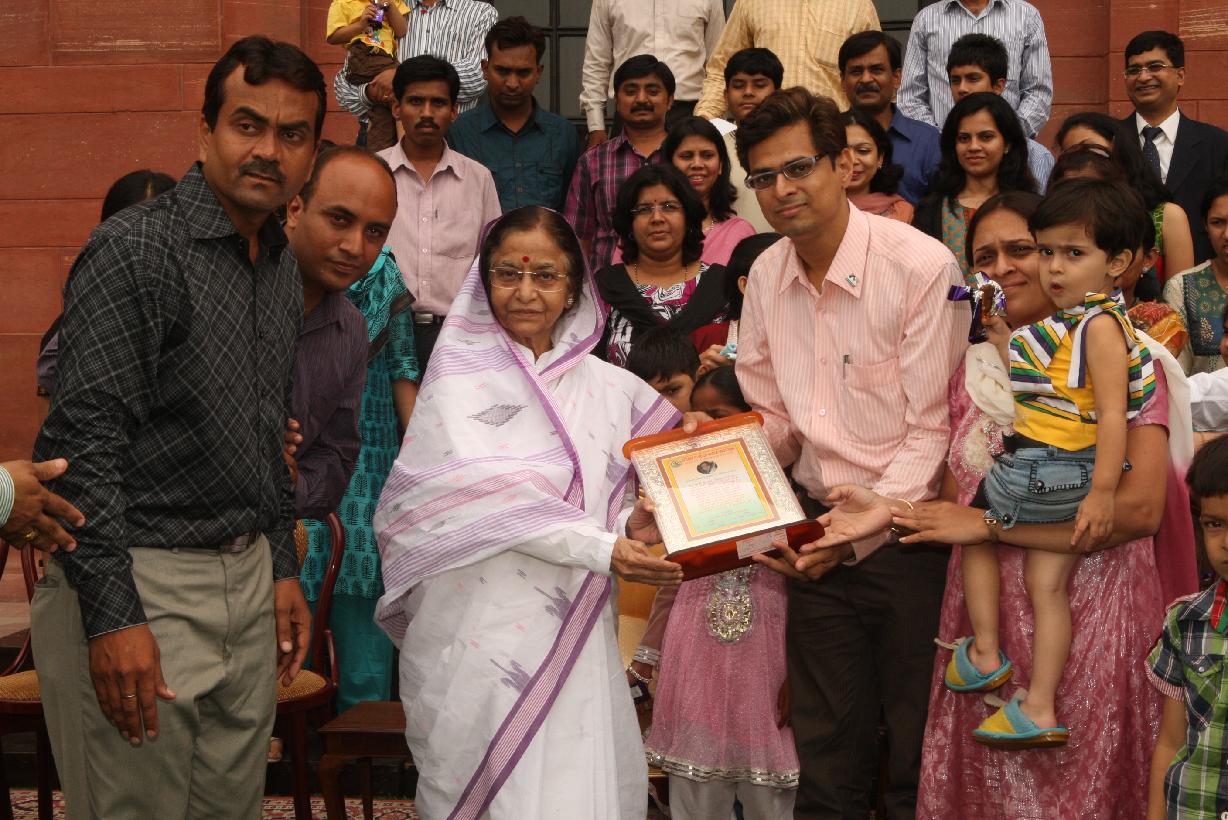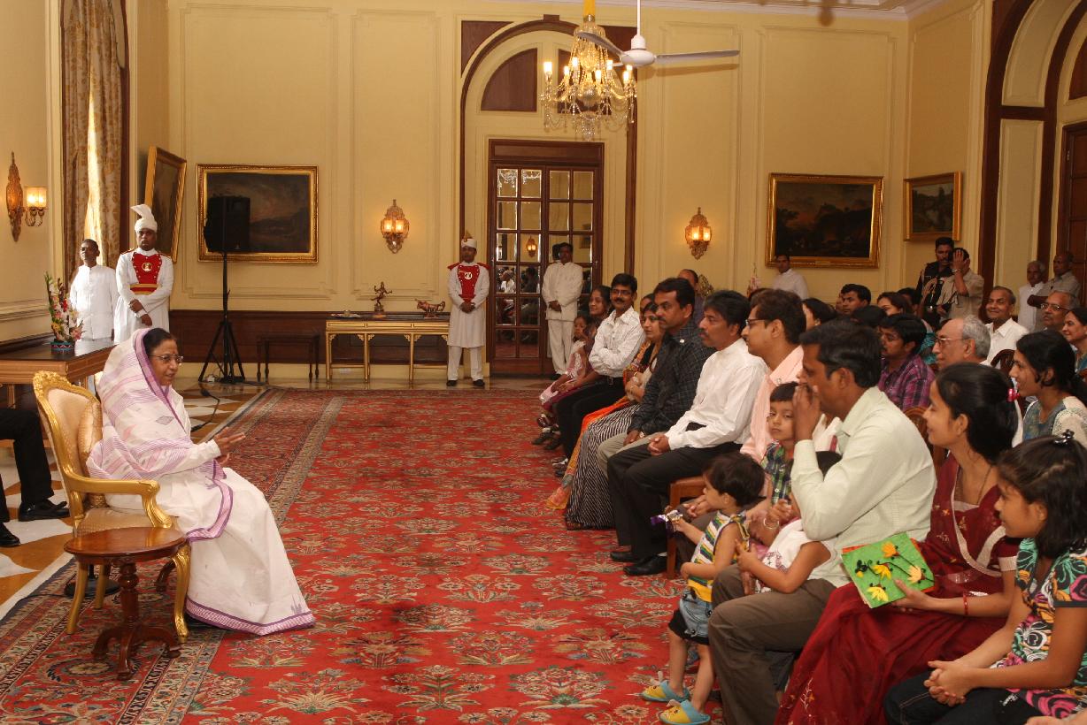 | Caption: | The President of India, Smt Pratibha Devisingh Patil interacting with Shri Manish Laddha and others at Rashtrapati Bhavan in New Delhi on June 15, 2011 |