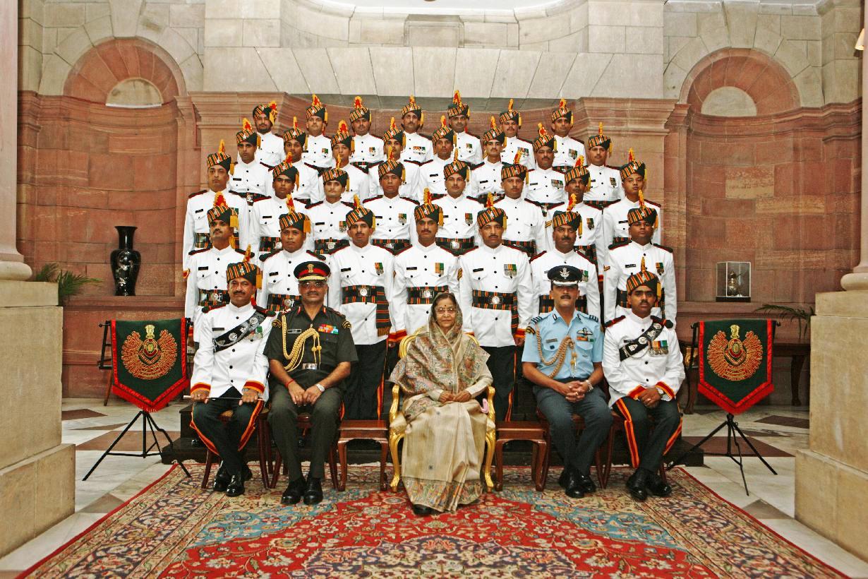| Caption: | The President of India, Smt Pratibha Devisingh Patil posing for a Group Photograph with the Band Personnel of the JAK RIF Regimental Centre Military Band at Rashtrapati Bhavan in New Delhi on June 27, 2011 |
