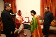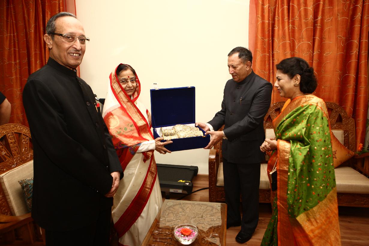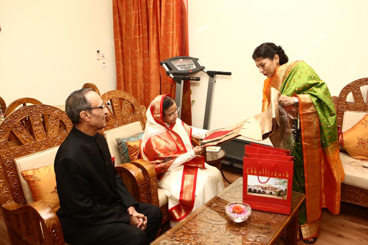 | Caption: | The President of India, Smt Pratibha Devisingh Patil exchanging Gifts with Governor of Chhattisgarh, Shri Shekhar Dutt at Raj Bhavan in Chhattisgarh on June 24, 2011 |