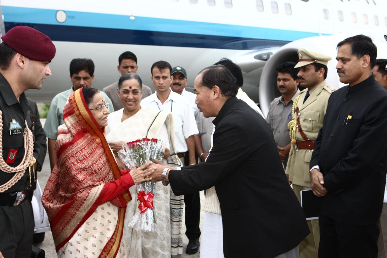 | Caption: | The President of India, Smt Pratibha Devisingh Patil being welcomed by the Governor of Uttarakhand, Smt Margaret Alva and Chief Minister, Shri B C Khanduri at Jolly Grant Airport of Dehradun in Uttarakhand on June 10, 2011 |