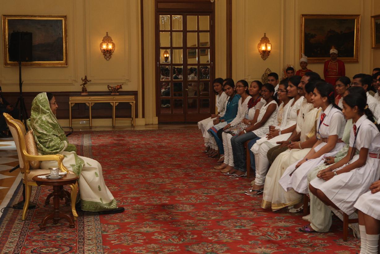 | Caption: | The President of India, Smt Pratibha Devisingh Patil interacting with the Students and Staff of Sankalp Social Cultural and Educational Academy at Rashtrapati Bhavan in New Delhi on Feb 23, 2011 |