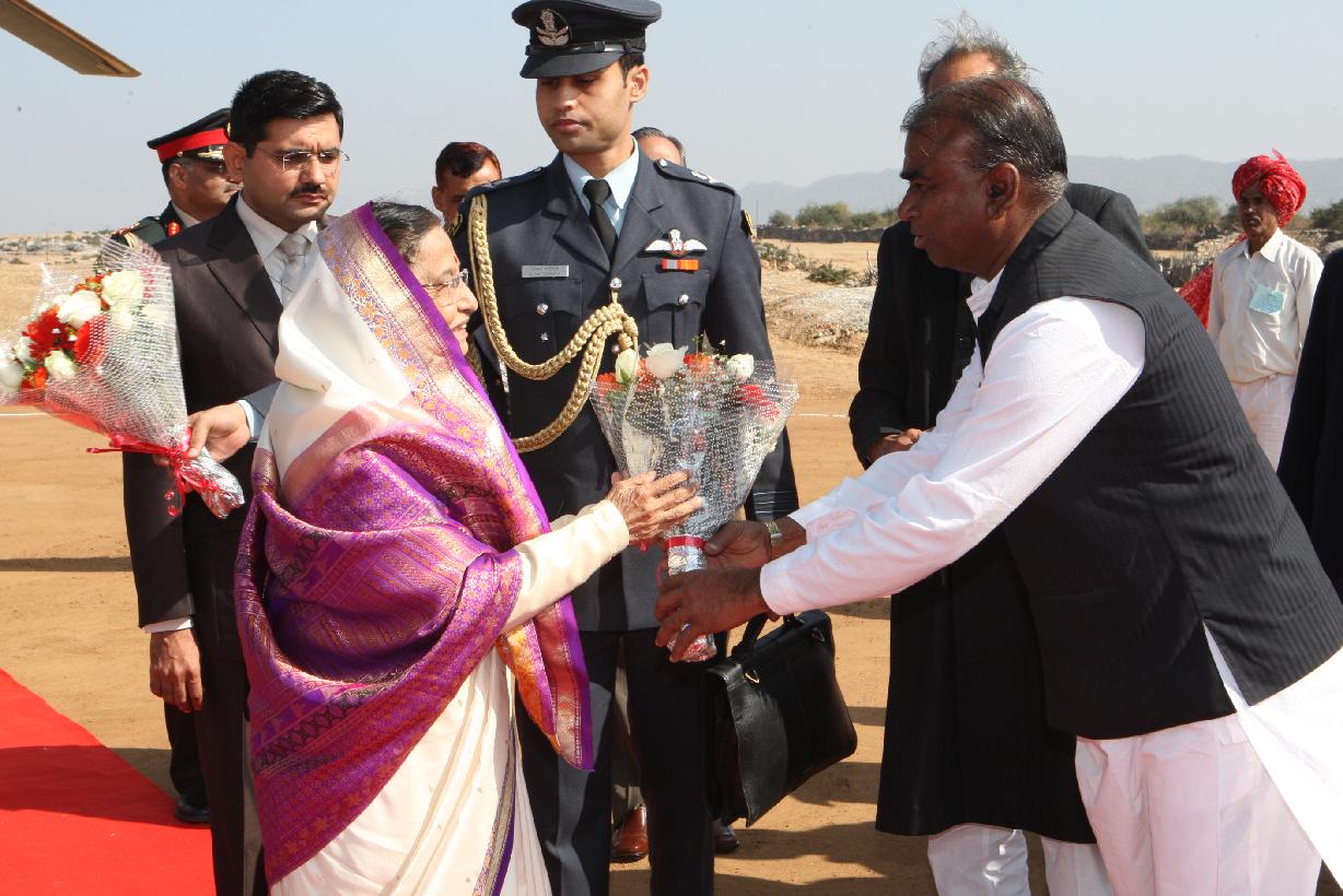 | Caption: | The President of India, Smt Pratibha Devisingh Patil being welcomed by the Chief Minister of Rajasthan Shri Ashok Gehlot at Diver Helipad in Udaipur in Rajasthan on Jan 10, 2012 |