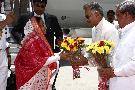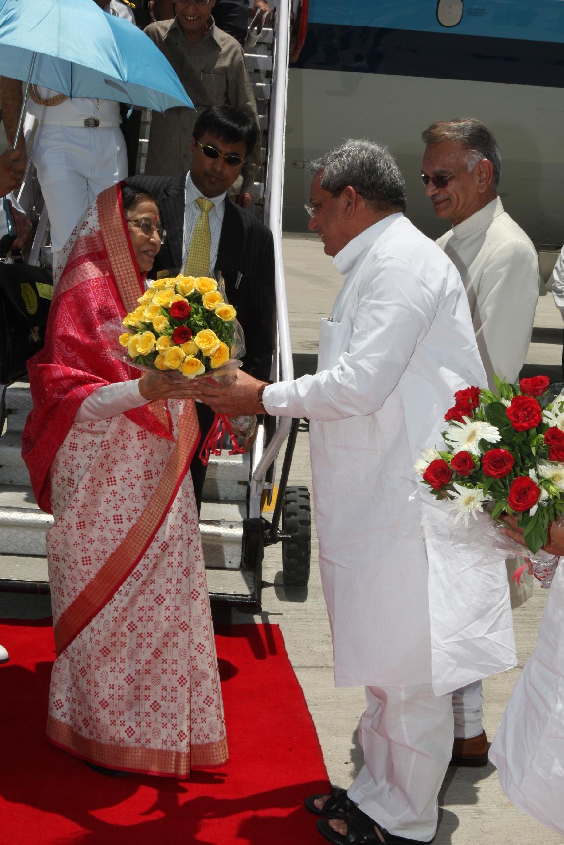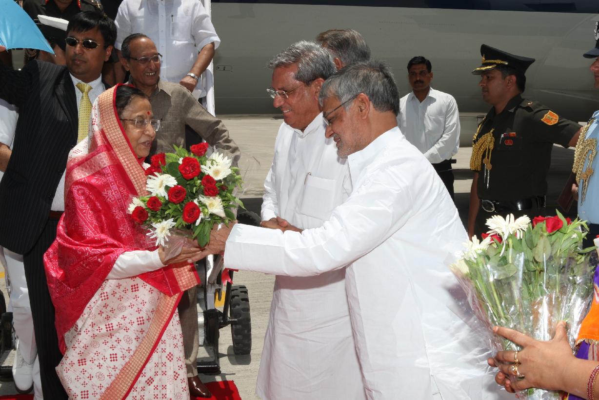 | Caption: | The President of India, Smt Pratibha Devisingh Patil being welcomed by the Governor of Rajasthan, Shri Shivraj Patil at Udaipur Airport in Rajasthan on May 11, 2011 |