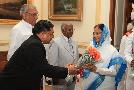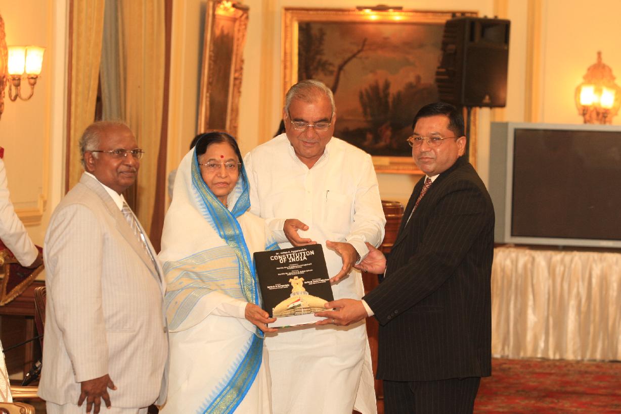 | Caption: | The President of India, Smt Pratibha Devisingh Patil presenting a Book titled 'Constitution of India' by Dr Adish C Aggarwala at Rashtrapati Bhavan in New Delhi on July 23, 2009 |