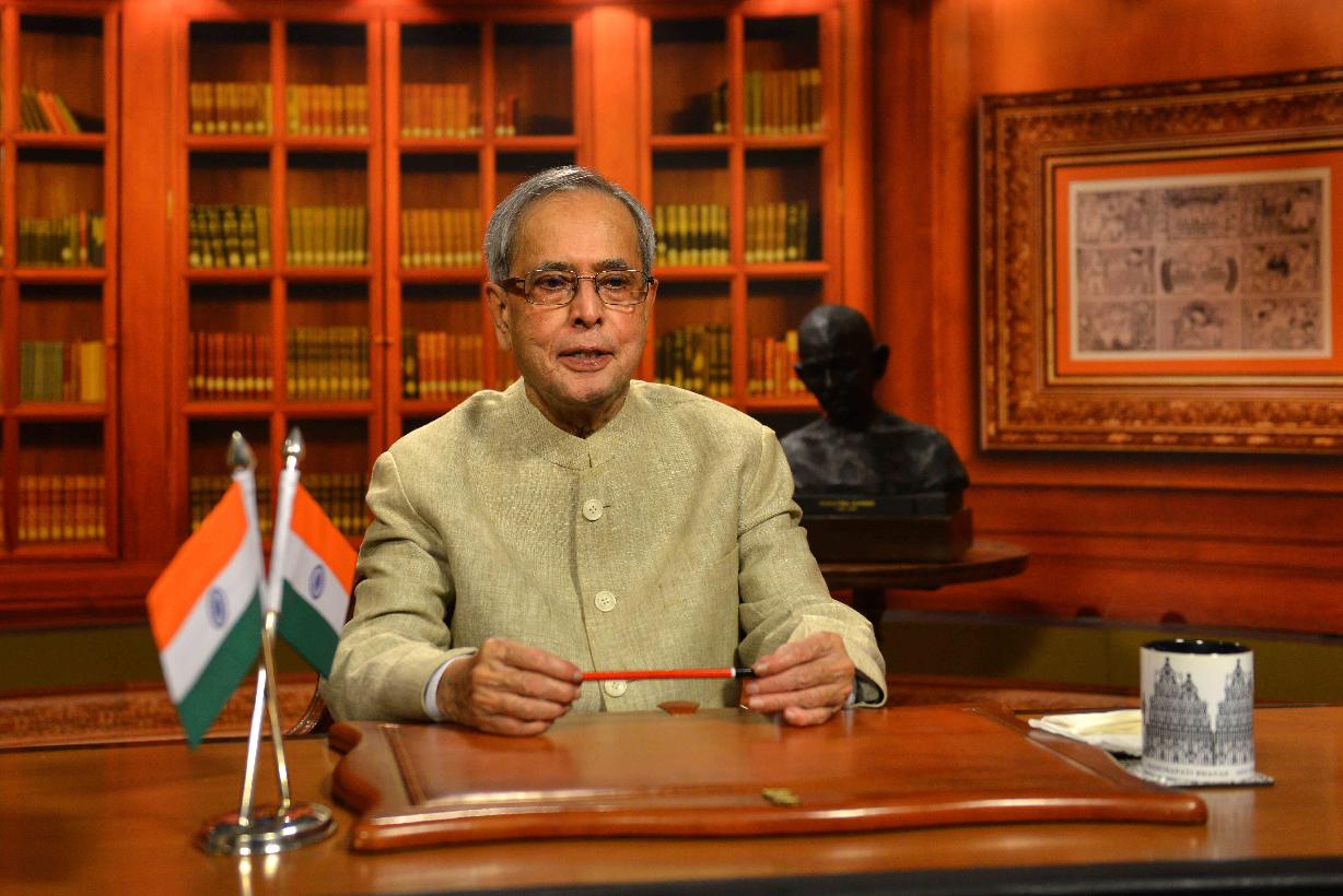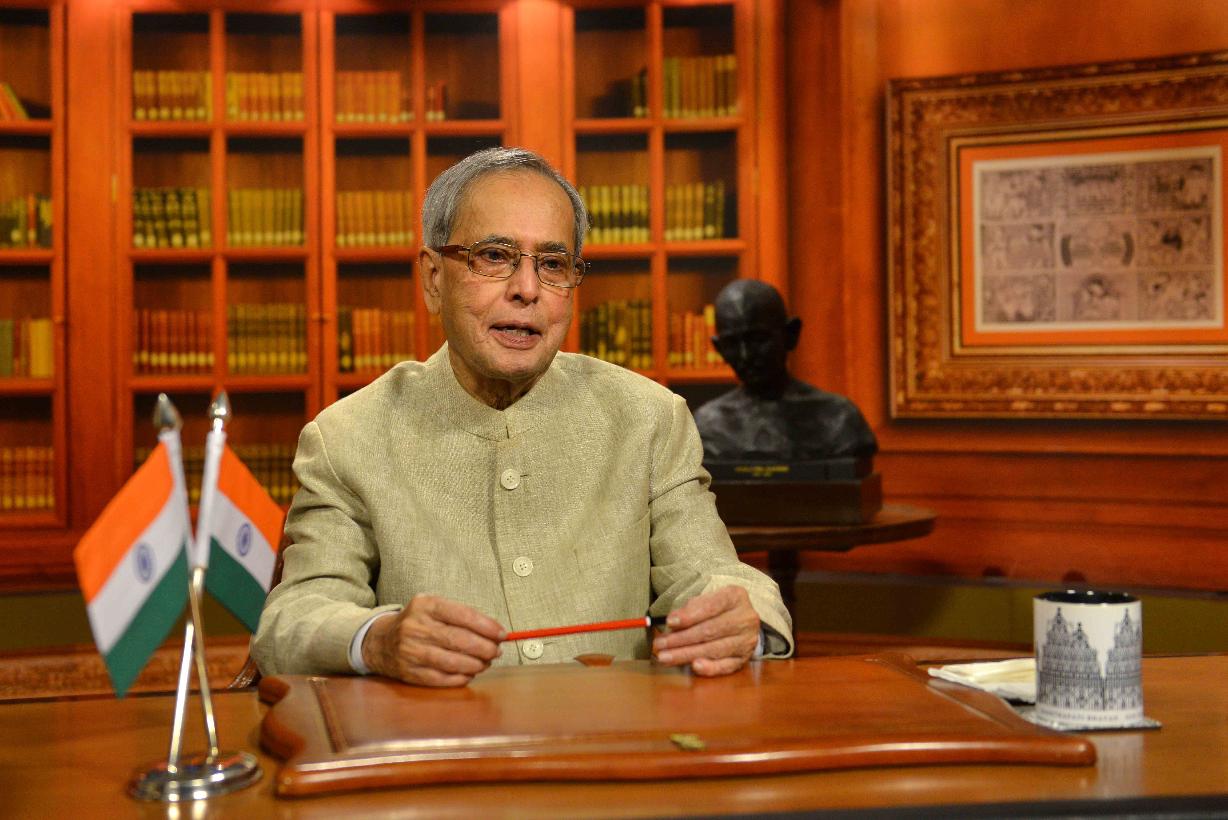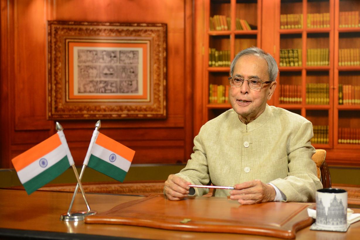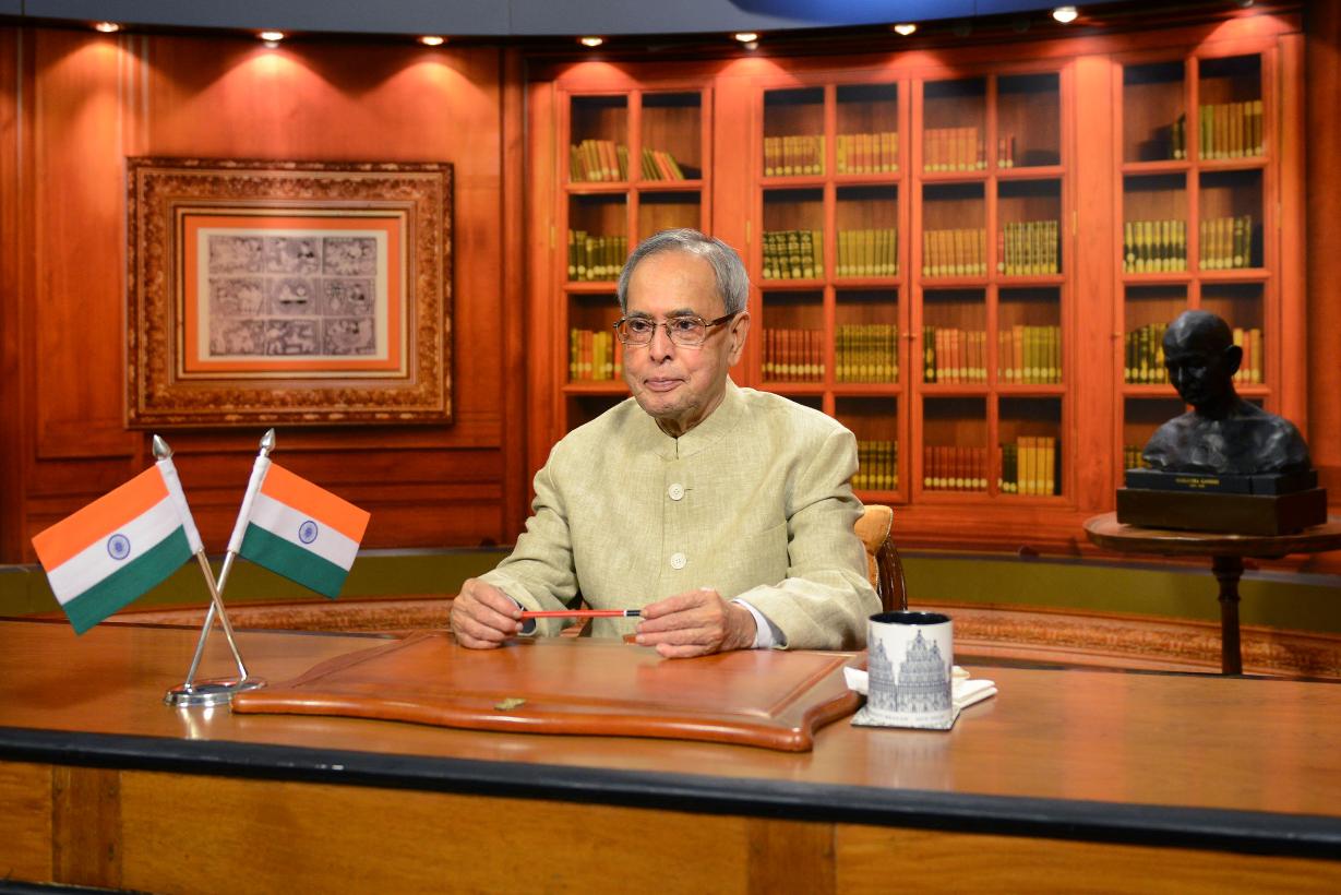 | Caption: | The President of India, Shri Pranab Mukherjee, addressing the nation on the eve of 66th Republic Day Celebration, at Rashtrapati Bhavan, in New Delhi on January 25, 2015 |