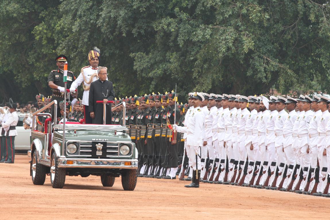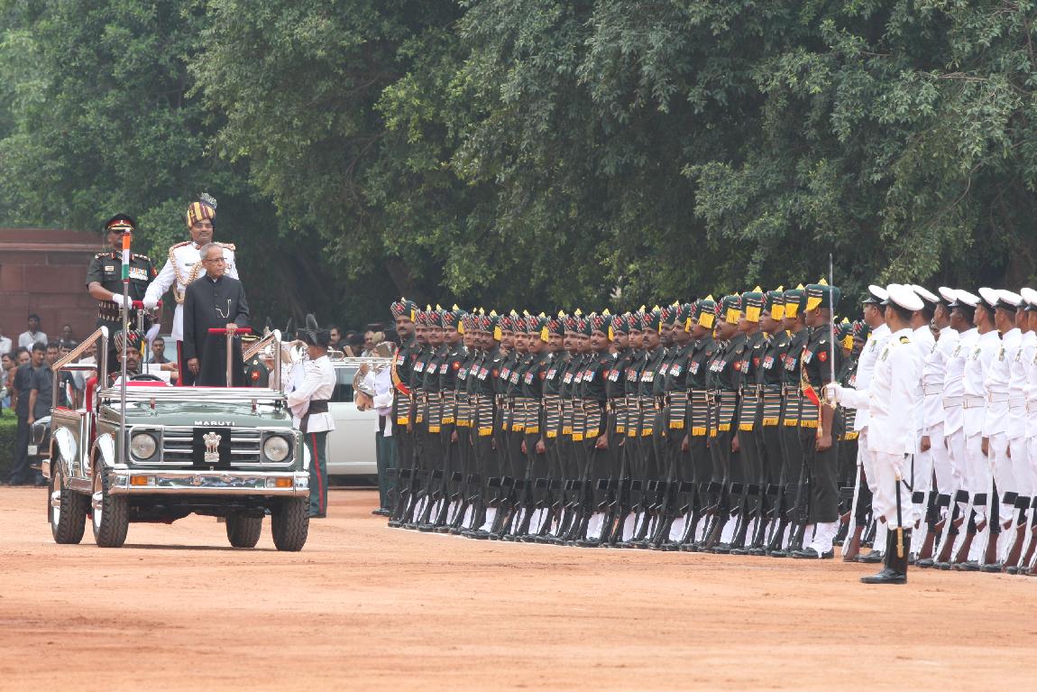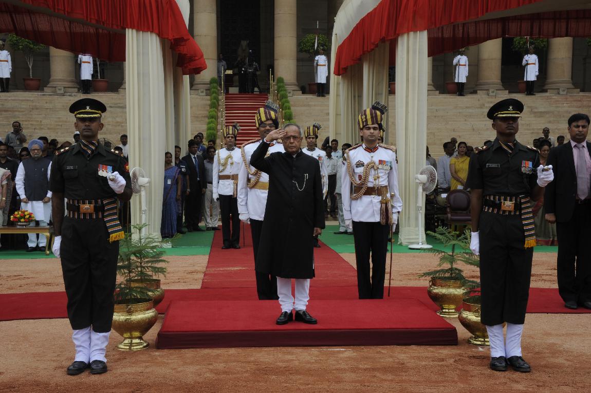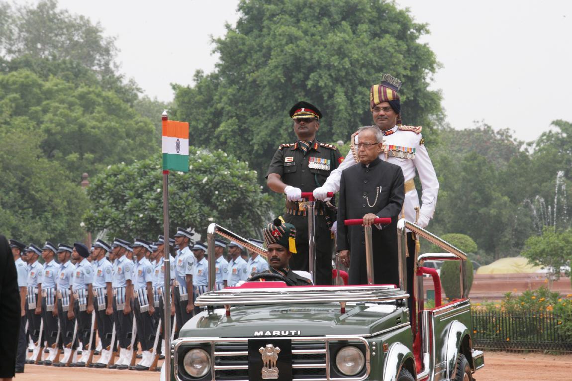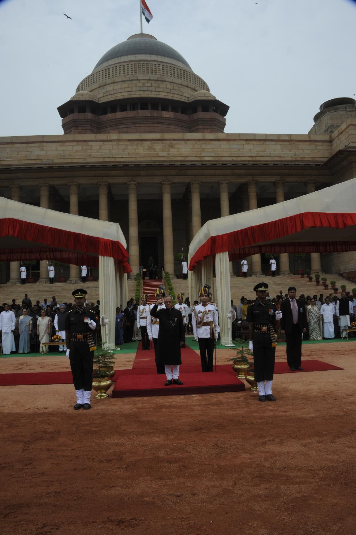 | Caption: | The President of India, Shri Pranab Mukherjee inspecting the Guard of Honour at Fore Court on July 25, 2012 |